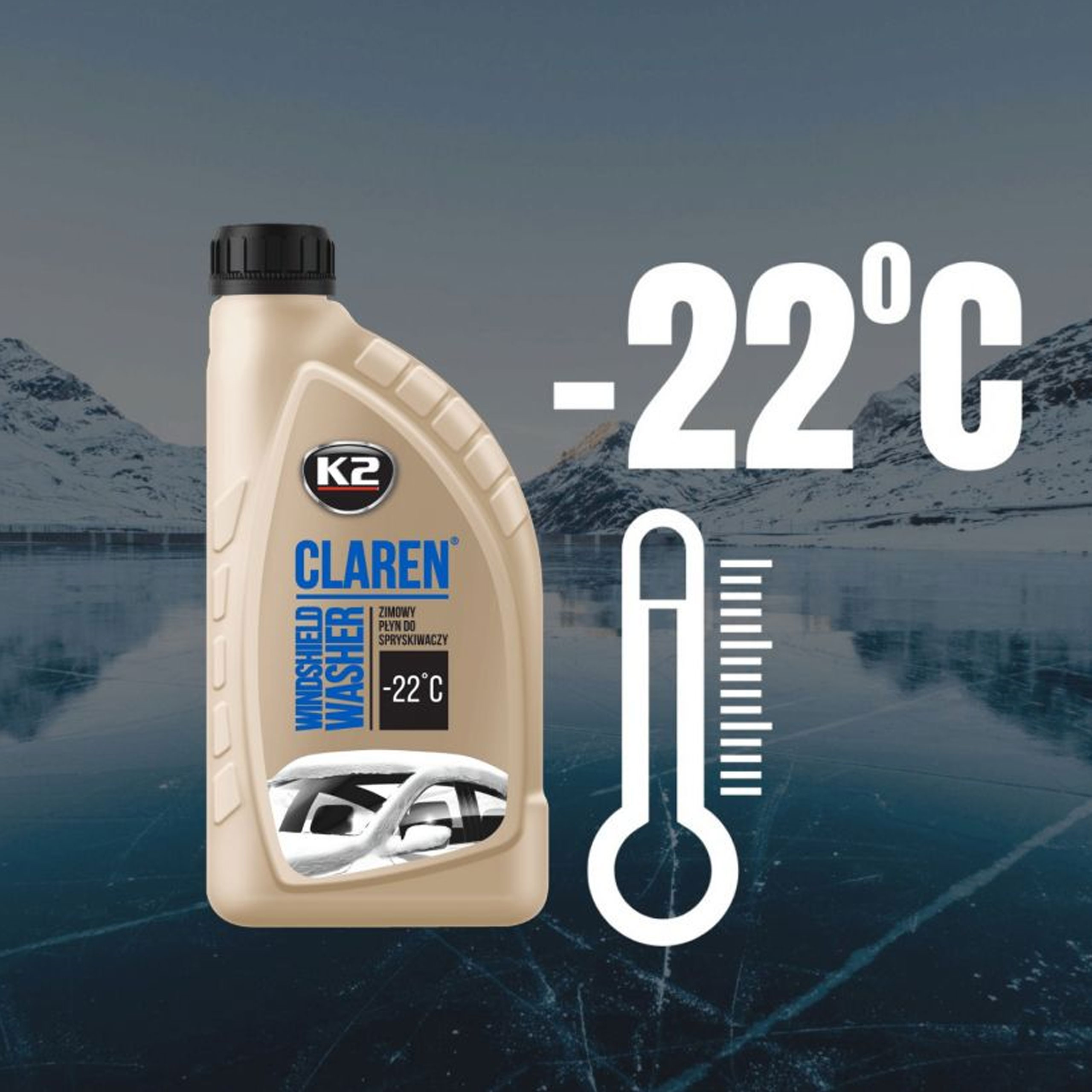 Unikalna receptura płynu do spryskiwaczy sprawia, że K2 Claren nie zamarza nawet w temperaturze sięgającej -22°C.