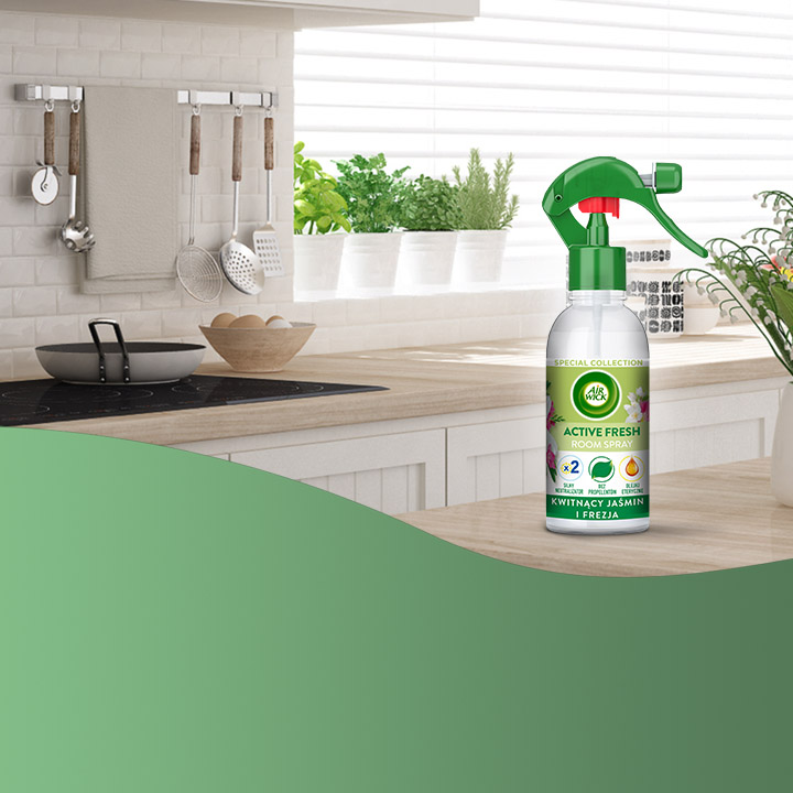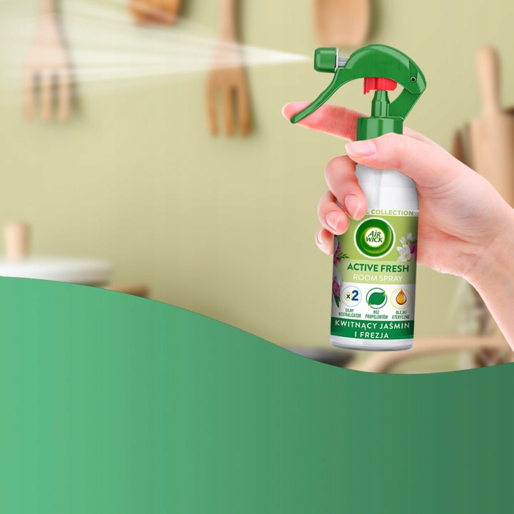 Air Wick Active Fresh Room Spray z 2x silniejszą technologią neutralizującą brzydkie zapachy*. Zawiera tylko te składniki, których potrzebujesz, aby zneutralizować brzydkie zapachy i odświeżyć wnętrze swojego domu.