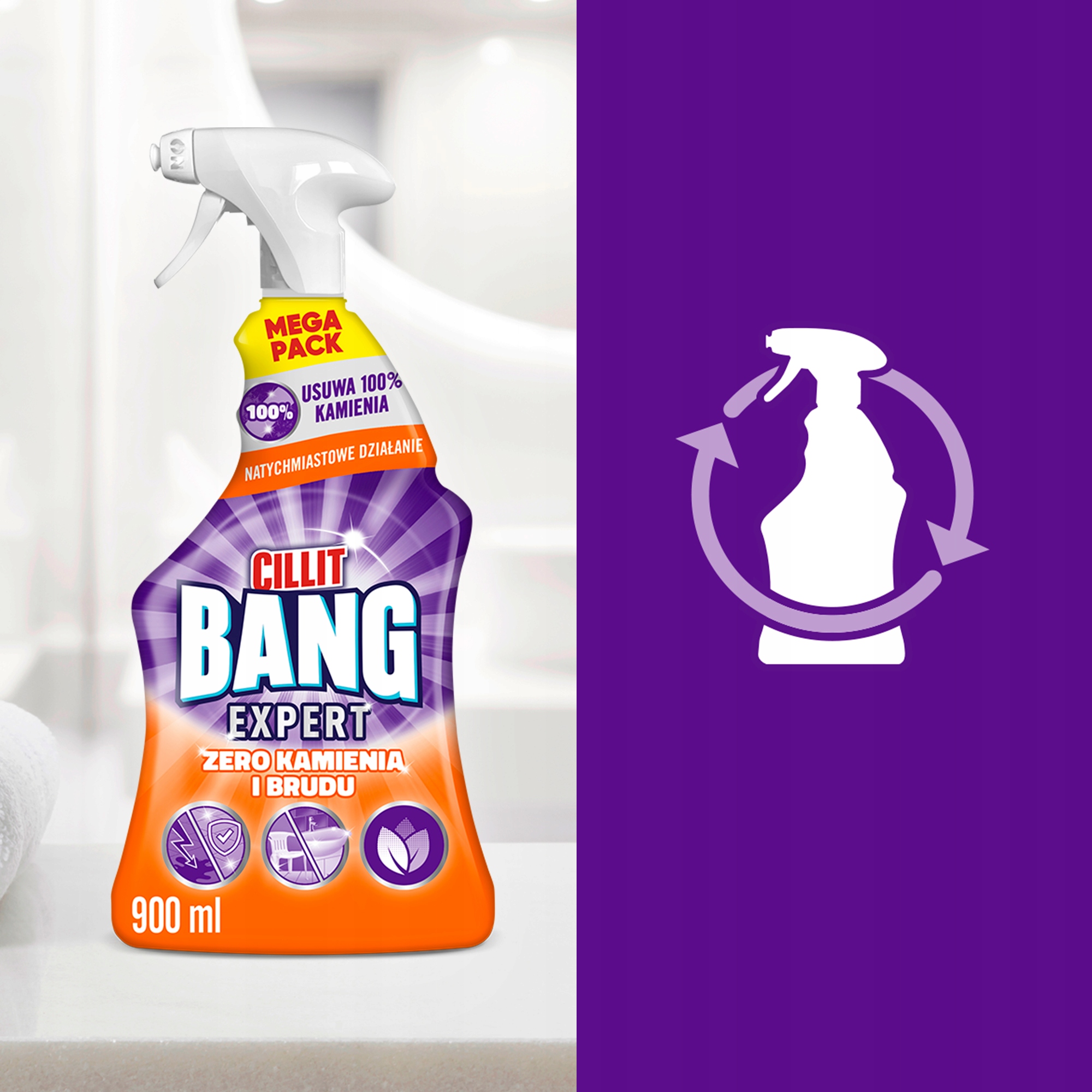 Butelki Cillit Bang Expert zawierają aż 59% plastiku pochodzącego z recyklingu miejskich odpadów, co stanowi część wkładu w ochronę środowiska. Wybierając produkty Cillit Bang, nie tylko dbasz o czystość swojego domu, ale również o planetę.