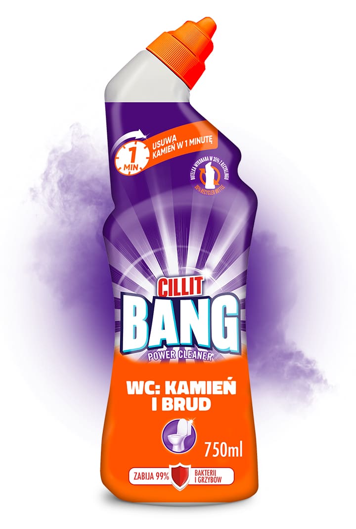 Z Cillit Bang WC Kamień i Brud skutecznie i szybko wyczyść oraz zdezynfekuj swoją toaletę. Nasz aktywny żel usuwa 100% kamienia* nawet w głębi toalety i rozpuszcza najbardziej uporczywe zabrudzenia (rdzę, plamy z moczu). Jego skuteczna formuła pozwala mu być aktywnym w każdym zakamarku Twojej toalety: zarówno pod powierzchnią wody, jak i przy krawędzi muszli oraz pozwala usunąć 99,9% bakterii i wirusów*, zapewniając czyste i higieniczne środowisko.Produktów biobójczych należy używać z zachowaniem śrdoków ostrożności. Przed każdym użyciem należy przeczytać etykietę i informacje dotyczące produktu.