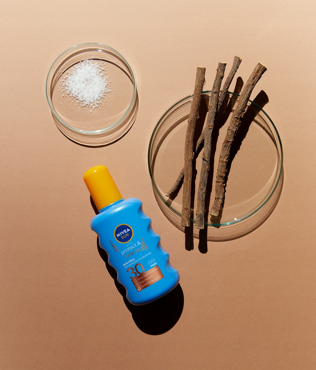 Aktywuj naturalną opaleniznę z balsamem do opalania w spray'u NIVEA SUN Protect & Bronze! Formuła z ekstraktem pro-melanin pobudza naturalne procesy opalania w skórze**, pomagając skórze osiągnąć złocisty kolor, bez samoopalacza. Jednocześnie zapewnia wysoką ochronę przeciwsłoneczną SPF 30, dzięki zawartości wysoce skutecznego systemu filtrów UVA/UVA. Spray do opalania natychmiastowo chroni przed poparzeniem i uszkodzeniami skóry, wywołanymi przez promieniowanie słoneczne. Produkt łatwo się aplikuje i nie pozostawia tłustej warstwy na skórze, a dodatkowo jest wodoodporny, aby zapewnić Twojej skórze bezpieczeństwo także podczas kąpieli.