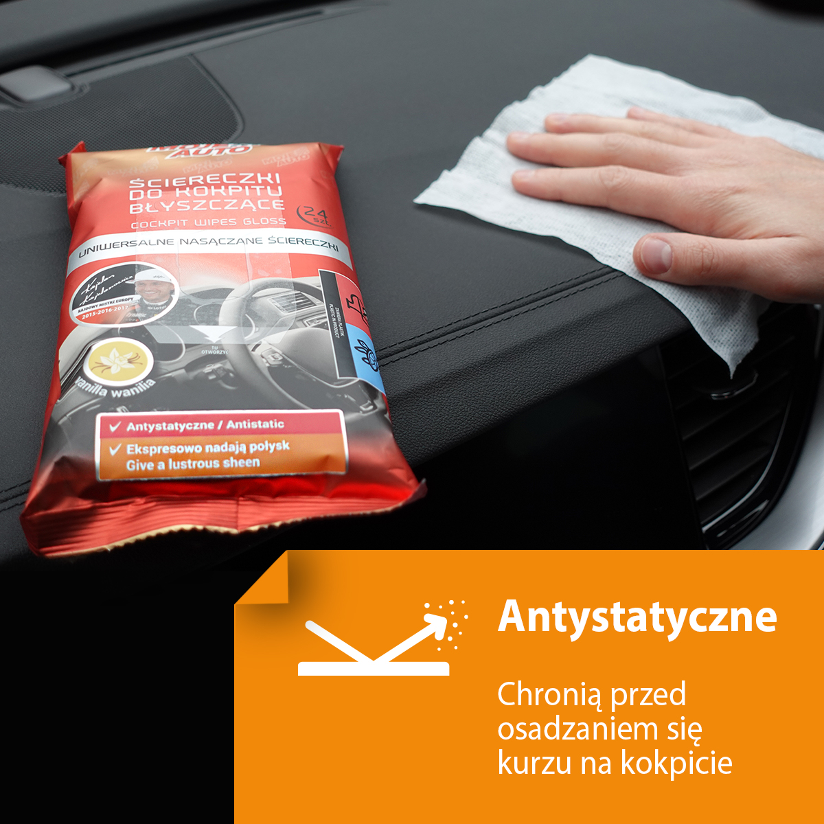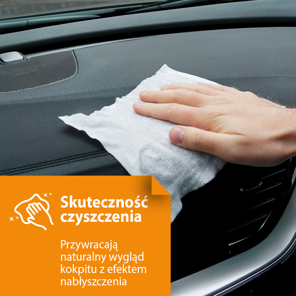 Bezpieczna dla powierzchni i nie pozostawia smug. Dzięki chusteczkom, Twój kokpit pozostanie czysty i lśniący na dłużej.