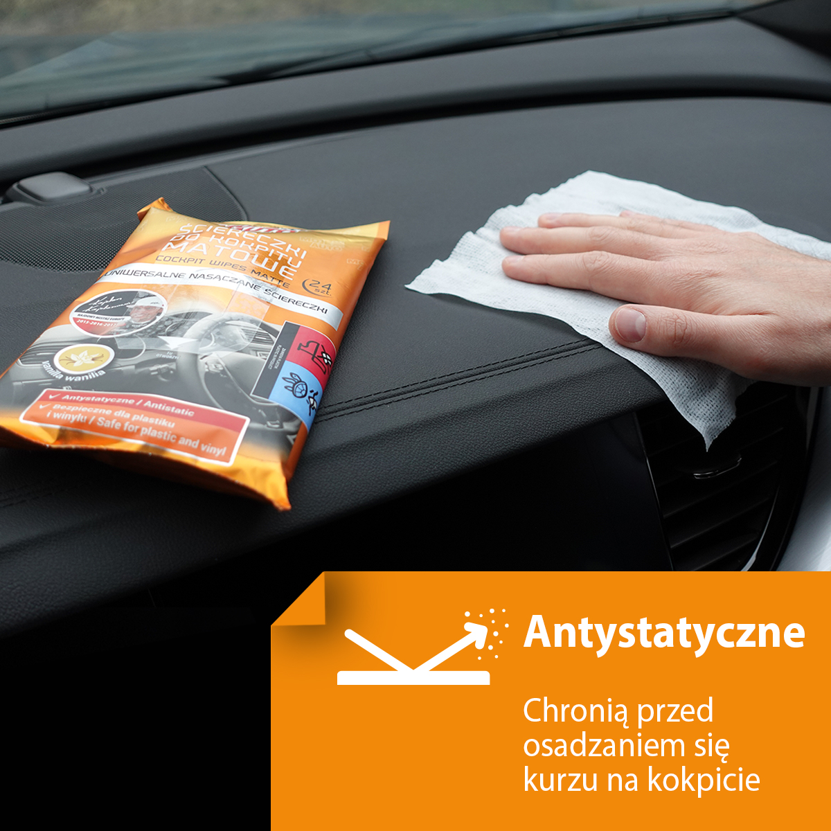 Bezpieczna dla powierzchni i nie pozostawia smug. Dzięki chusteczkom, Twój kokpit pozostanie czysty i lśniący na dłużej.