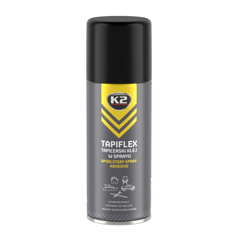 Posiada szeroką gamę zastosowań. K2 TAPIFLEX w 100% sprawdza się jako klej do podsufitki. Klei bezproblemowo: samochodową podsufitkę, obicia ze sztucznej skóry lub materiału, maty wygłuszające. Zastosowanie znajdzie podczas naprawy siedzisk czy renowacji mebli tapicerowanych. Z powodzeniem można nim mocować wycieraczki i chodniki do podłogi, wygłuszać ściany za pomocą pianki akustycznej.