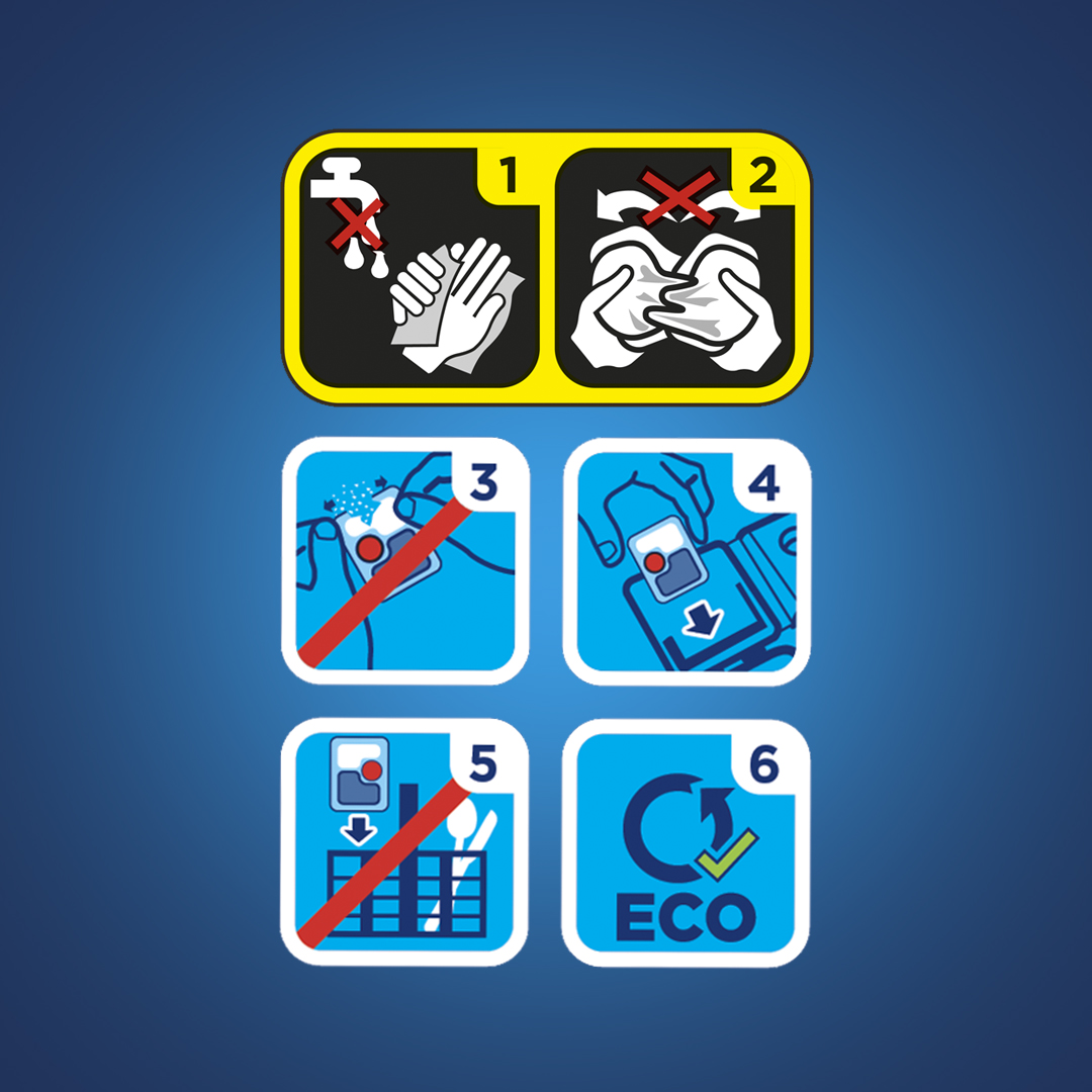 1. Nie dotykać produktu mokrymi rękami.2. Nie rozdzielać sklejonych kapsułek.3. Nie zdejmuj folii z kapsułki, ani nie przecinaj. Rozpuszcza się całkowicie podczas mycia.4. Do każdego zmywania umieść jedną kapsułkę w SUCHYM dozowniku.5. Nie umieszczaj w koszyku na sztućce.6. W celu osiągnięcia najlepszych rezultatów korzystaj z programów eco lub auto.Funkcja soli jest skuteczna w wodzie o niskim, średnim i wysokim stopniu twardości do 26°e/21°dH.W przypadku wody bardzo twardej należy użyć soli Finish do zmywarek.W celu ochrony jakości kapsułek Finish Ultimate zawsze szczelnie zamykać torebkę oraz przechowywać ją z dala od źródeł ciepła i wilgoci.Płyn nabłyszczający Finish jest polecany dla najlepszych efektów schnięcia.To opakowanie nadaje się do recyklingu tylko po całkowitym opróżnieniu! Wyrzucaj do odpowiednio oznakowanych pojemników.Oszczędzaj wodę, nie opłukuj naczyń!