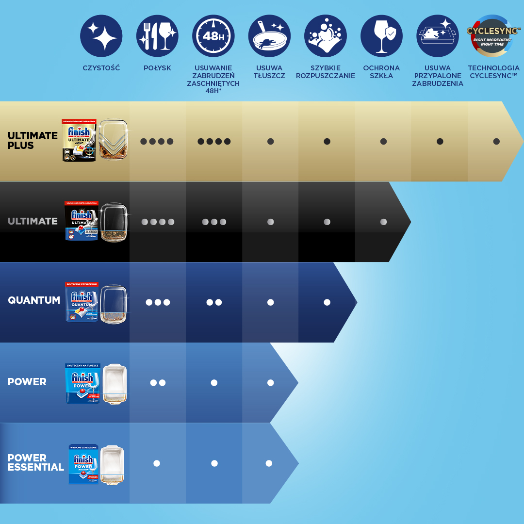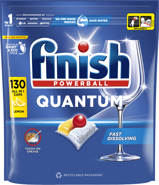 Finish Quantum to intensywne czyszczenie i diamentowy standard blasku Twoich sztućców i naczyń. Nawet bez wstępnego spłukiwania przed włożeniem do zmywarki osiągniesz perfekcyjne rezultaty zmywania.Aby uzyskać niezrównaną czystość naczyć, wypróbuj: