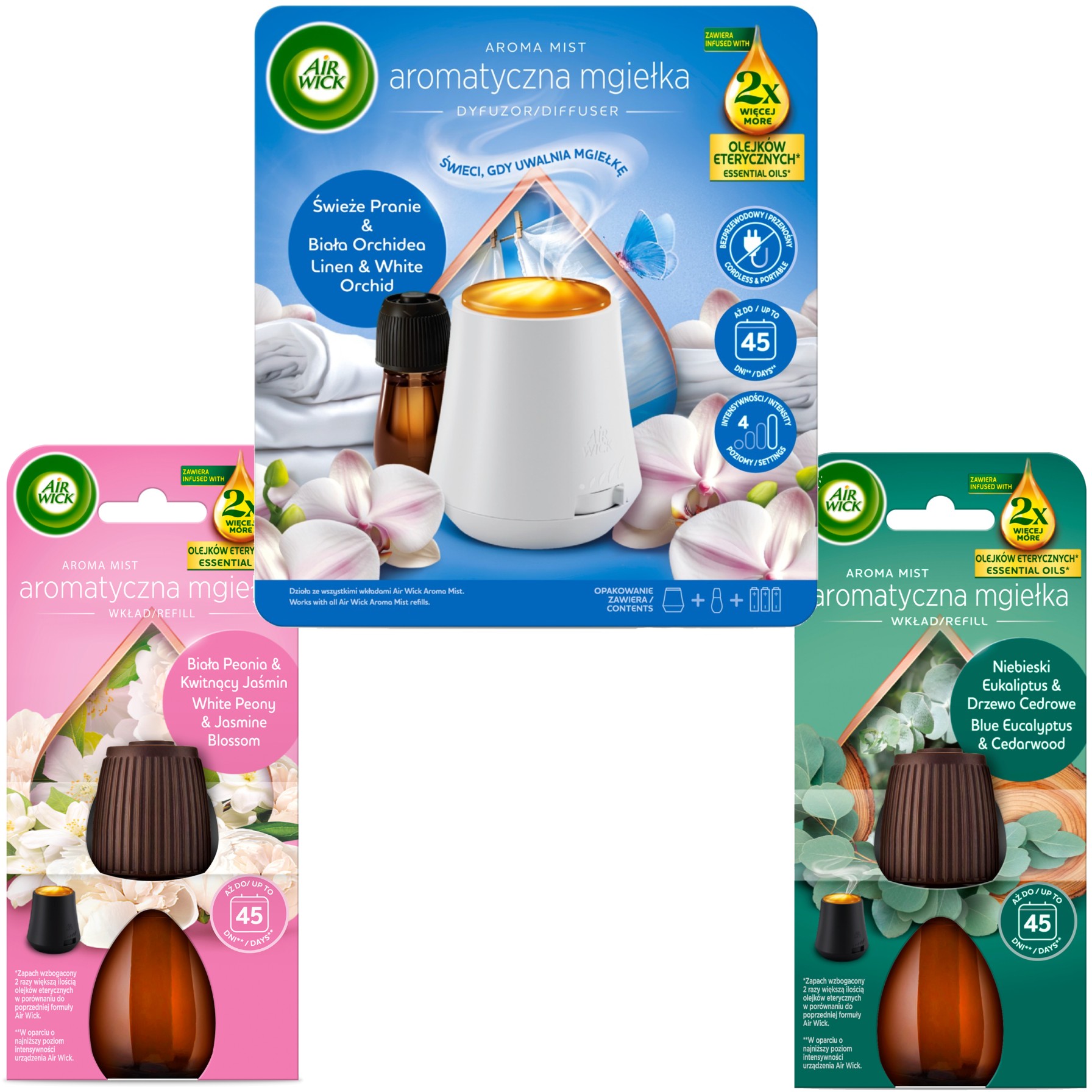 *Zapach wzbogacony 2 razy większą ilością olejków eterycznych w porównaniu do poprzedniej formuły Air Wick.**W oparciu o najniższy poziom intensywności urządzenia Air Wick