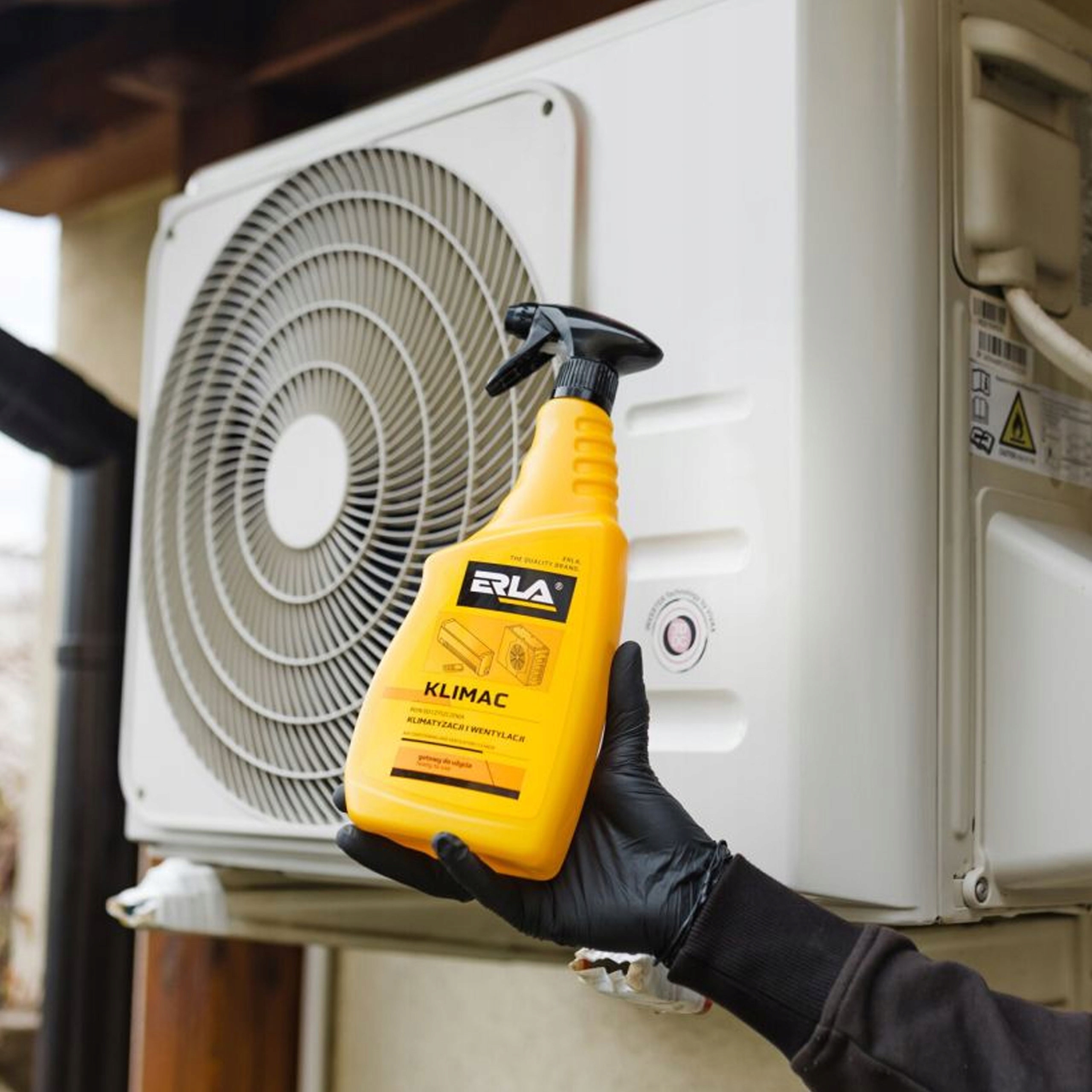 Płyn Erla Klimac jest przeznaczony do czyszczenia parowników, skraplaczy, filtrów wewnątrz i na zewnątrz budynków. Precyzyjnie opracowany preparat marki Erla, to niezawodny środek niezbędny w hotelach, lokalach gastronomicznych, halach przemysłowych, domach. Niezbędny w każdym miejscu, w którym zamontowana jest klimatyzacja. Bez używania tego środka, powietrze wydobywające się z klimatyzatora, może mieć nieprzyjemny zapach i zagrażać zdrowiu. Unikatowa konsystencja na bazie piany, która dłużej działa, opadając dopiero po 10 minutach, zapewnia precyzyjne czyszczenie klimatyzacji. Systematyczne stosowanie płynu do czyszczenia klimatyzacji wydłuża żywotność i zwiększa efektywność urządzenia. W celu zapewnienia komfortu przebywania w klimatyzowanych pomieszczeniach, urządzenia klimatyzacyjne powinny być czyszczone przynajmniej dwa razy w roku w okresach: marzec – maj i październik – listopad.