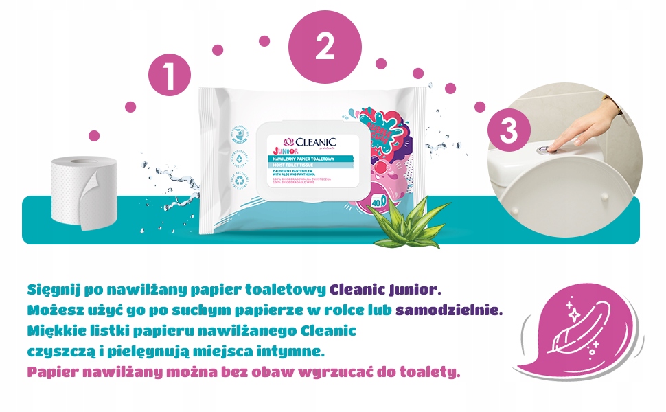 Bezpieczna i skuteczna formuła: Składniki nawilżonego papieru toaletowego Cleanic Junior, takie jak pantenol, ekstrakt z rumianku i sok z aloesu, zostały starannie dobrane, aby zapewnić bezpieczeństwo i skuteczność codziennej higieny.