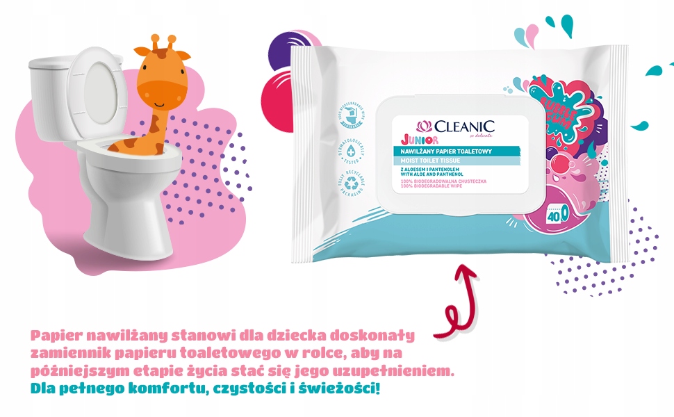 Komfort i higiena: Papier nawilżany Cleanic Junior zapewni dziecku pełen komfort podczas korzystania z toalety. To doskonałe uzupełnienie codziennej higieny. W każdym opakowaniu znajduje się 40 chusteczek, co zapewnia dłuższe użytkowanie i wygodę