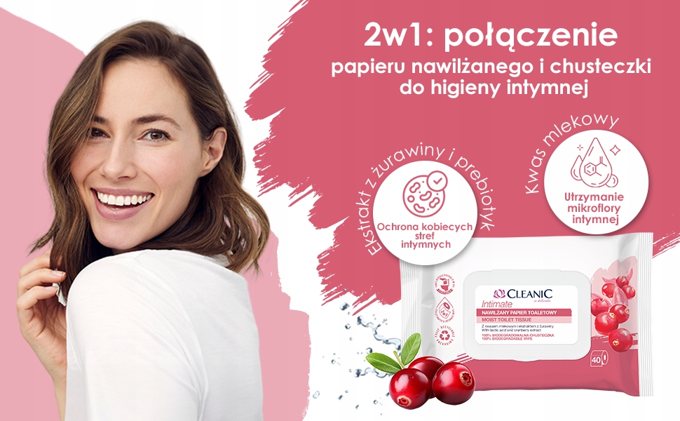 CLEANIC INTIMATE Nawilżany papier toaletowy z ekstraktu z żurawiny 40 sztuk