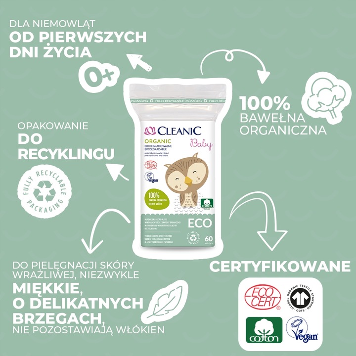 Certyfikowane płatki dla niemowląt Cleanic Baby ECO to idealny produkt do oczyszczania skóry. Możesz nasączyć je kosmetykiem lub po prostu wodą. W tej roli z powodzeniem świetnie zastąpią nawilżane chusteczki. Płatki również świetnie nadadzą się do osuszania twarzy, fałdek skórnych czy pachwin. Wykonane są w 100% z bawełny organicznej, czyli takiej, która uprawiana jest bez użycia nawozów sztucznych oraz pestycydów.