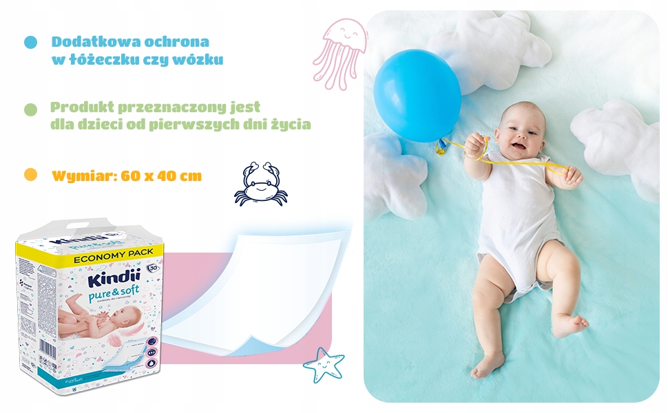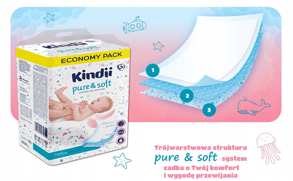 Podkłady Kindii Pure & Soft zostały stworzone specjalnie dla niemowląt ze skórą wrażliwą. Trójwarstwowa struktura Pure & Soft system gwarantuje komfort i wygodę przewijania. Wierzchnia, miękka i delikatna warstwa oddychająca jest przyjazna dla skóry dziecka. Środkowa warstwa skutecznie absorbuje i zatrzymuje wilgoć. Nieprzepuszczalna i antypoślizgowa warstwa spodnia, w atrakcyjny, dziecięcy wzór, chroni przed przeciekaniem. Podkłady zapewniają czystą, wygodną i higieniczną powierzchnię do przewijania. Sprawdzą się również jako dodatkowa ochrona w łóżeczku czy wózku.
