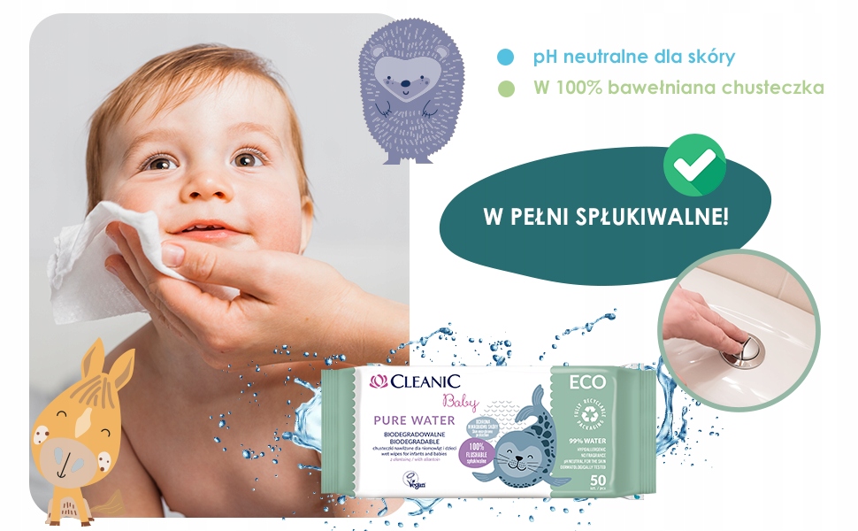Testowane dermatologicznie i o neutralnym pH dla skóry: Chusteczki nawilżane Cleanic Baby Eco Pure Water zapewniają nie tylko skuteczną pielęgnację, ale także bezpieczeństwo, potwierdzone testami dermatologicznymi. pH jest neutralne dla skóry. To produkt, na którym możesz polegać.