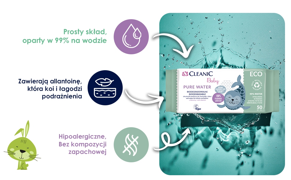 Skuteczne oczyszczanie i 99% wody: Chusteczki Cleanic Baby Eco Pure Water posiadają prostą, ale skuteczną formułę, która delikatnie oczyszcza skórę niemowląt i dzieci, zachowując jej naturalną równowagę.