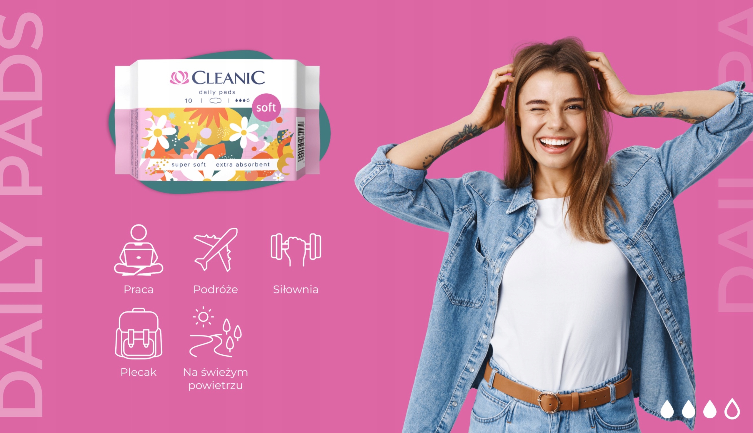 Specjalnie dla Ciebie połączyliśmy wykonaną w przełomowej technologii podwójną warstwę chłonną, skutecznie chroniącą przed przeciekaniem, i elastyczną warstwę wierzchnią, super wygodną i miękką dla Twojej skóry. Cleanic Soft – to 100% pewności, bez względu na to, co przyniesie dzień ☀️