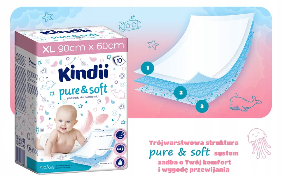 Podkłady Kindii Pure & Soft zostały stworzone specjalnie dla niemowląt ze skórą wrażliwą. Trójwarstwowa struktura Pure & Soft system gwarantuje komfort i wygodę przewijania. Wierzchnia, miękka i delikatna warstwa oddychająca jest przyjazna dla skóry dziecka. Środkowa warstwa skutecznie absorbuje i zatrzymuje wilgoć. Nieprzepuszczalna i antypoślizgowa warstwa spodnia, w atrakcyjny, dziecięcy wzór, chroni przed przeciekaniem. Podkłady zapewniają czystą, wygodną i higieniczną powierzchnię do przewijania. Sprawdzą się również jako dodatkowa ochrona w łóżeczku czy wózku.