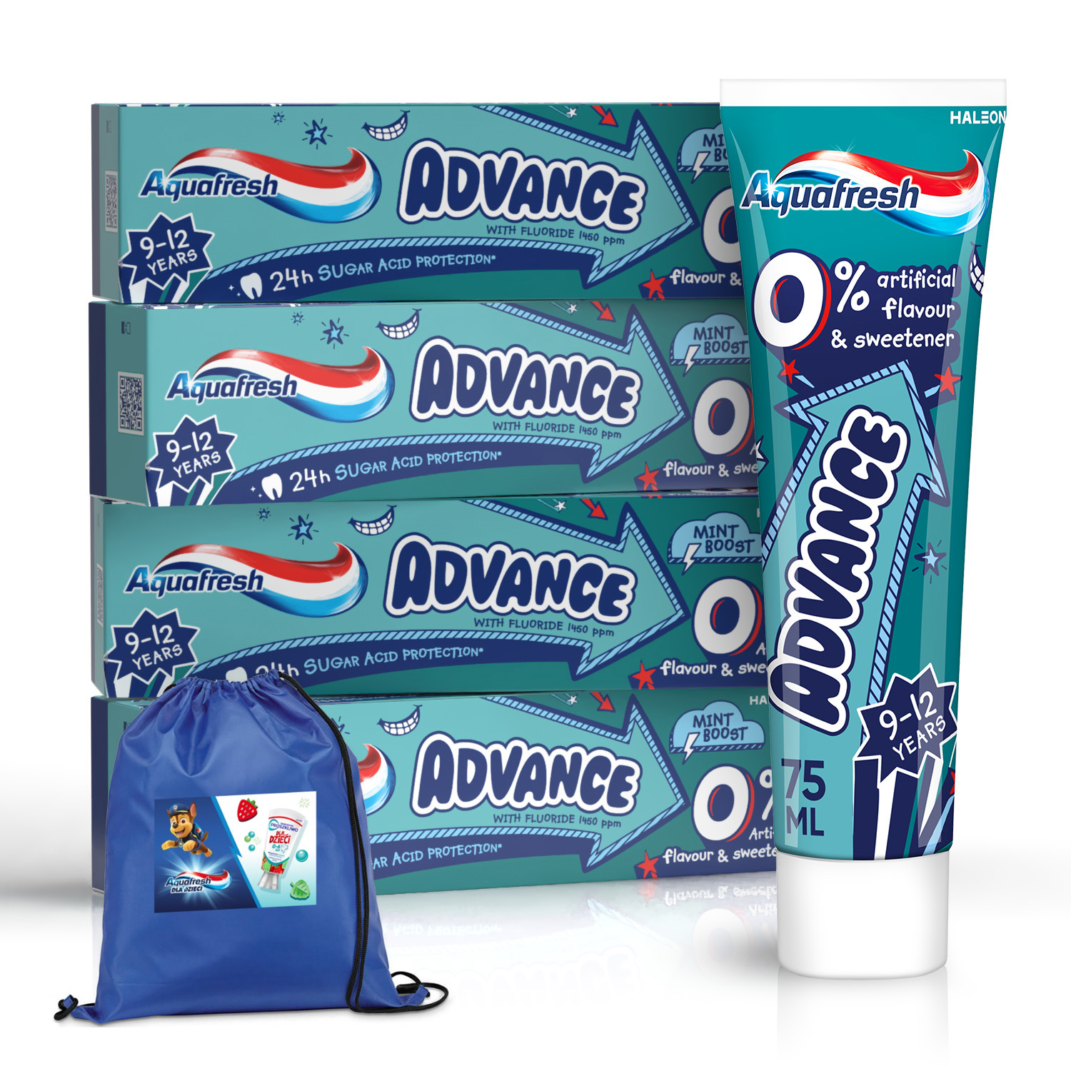 AQUAFRESH ADVANCE PASTA DO ZĘBÓW DLA DZIECI 9-12 LAT 75ML x4 + Plecak Gatis