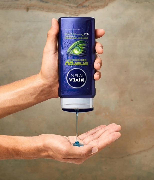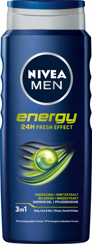 Żel pod prysznic dla mężczyzn 3w1 NIVEA MEN Energy to wyjątkowa, wielofunkcyjna formuła przeznaczona do mycia ciała, twarzy i włosów. NIVEA MEN skutecznie oczyszcza skórę i włosy bez przesuszania, a jednocześnie gwarantuje długotrwałe, 24-godzinne uczucie świeżości i energię na cały dzień! Formuła męskiego żelu pod prysznic została wzbogacona o ekstrakt z mięty, zapewniając świeży, męski zapach, który każdego dnia pobudzi Cię do działania. Żel pod prysznic NIVEA to kosmetyk przygotowany specjalnie z myślą o mężczyznach - zapewnia kompleksową pielęgnację pod prysznicem i działa na jak prawdziwy zastrzyk energii. Formuła NIVEA Energy jest w 99% biodegradowalna (zgodnie z OECD lub zbliżonymi metodami), a butelka (wyłączając etykietę i nakrętkę) została wykonana w 97% z odzyskanego plastiku..