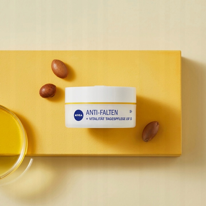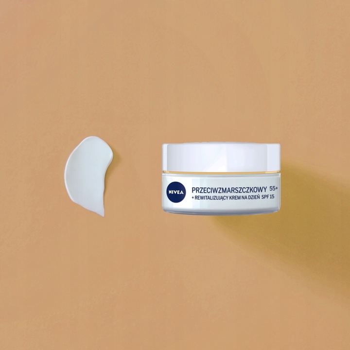 NIVEA stworzyła linię pielęgnujących kremów przeciwzmarszczkowych inspirowanych potrzebami cery w różnym wieku. Kremy te, dzięki zawartości drogocennych olejków i idealnie dobranych składników aktywnych wydobywają naturalne piękno Twojej skóry, byś mogła wyglądać wyjątkowo i czuć się pewna siebie niezależnie od wieku. Po 55 roku życia odczuwasz jak zmienia się Twoja skóra. Traci swoją witalność, a zmarszczki stają się coraz bardziej widoczne. NIVEA® PRZECIWZMARSZCZKOWY + REWITALIZUJĄCY KREM NA DZIEŃ 55+ wspiera witalność dojrzałej, wymagającej skóry. Aktywna formuła z cennym Olejkiem Arganowym widocznie redukuje linie mimiczne i zmarszczki od wewnątrz. Wzbogacony w wapń i SPF 15 krem wspiera witalność i zwiększa odporność cery na wysuszanie. NIVEA dba o Twoją skórę i planetę,. Formuła nie zawiera mikroplastiku*, a słoik został wykonany w 50% z materiału z recyklingu.