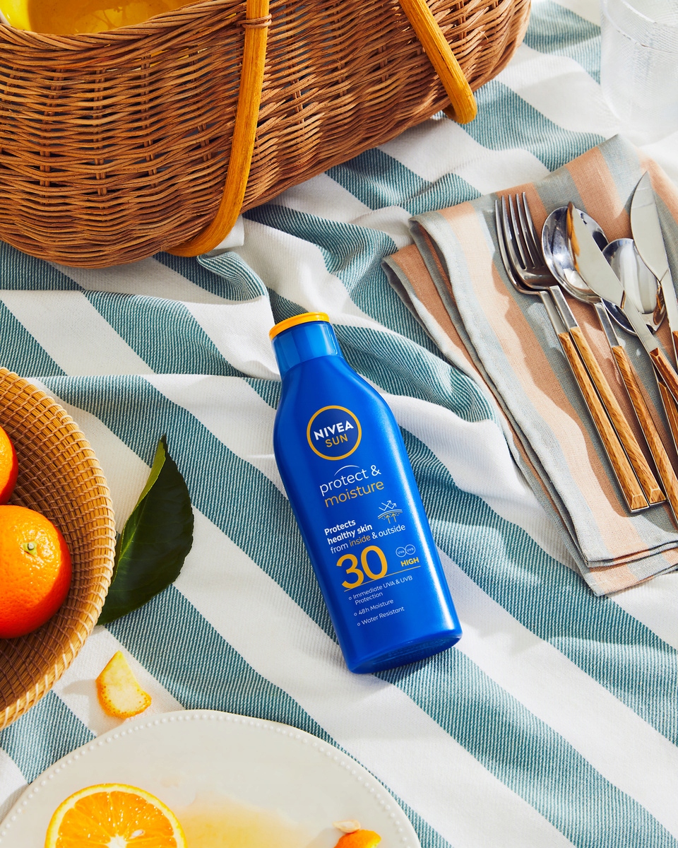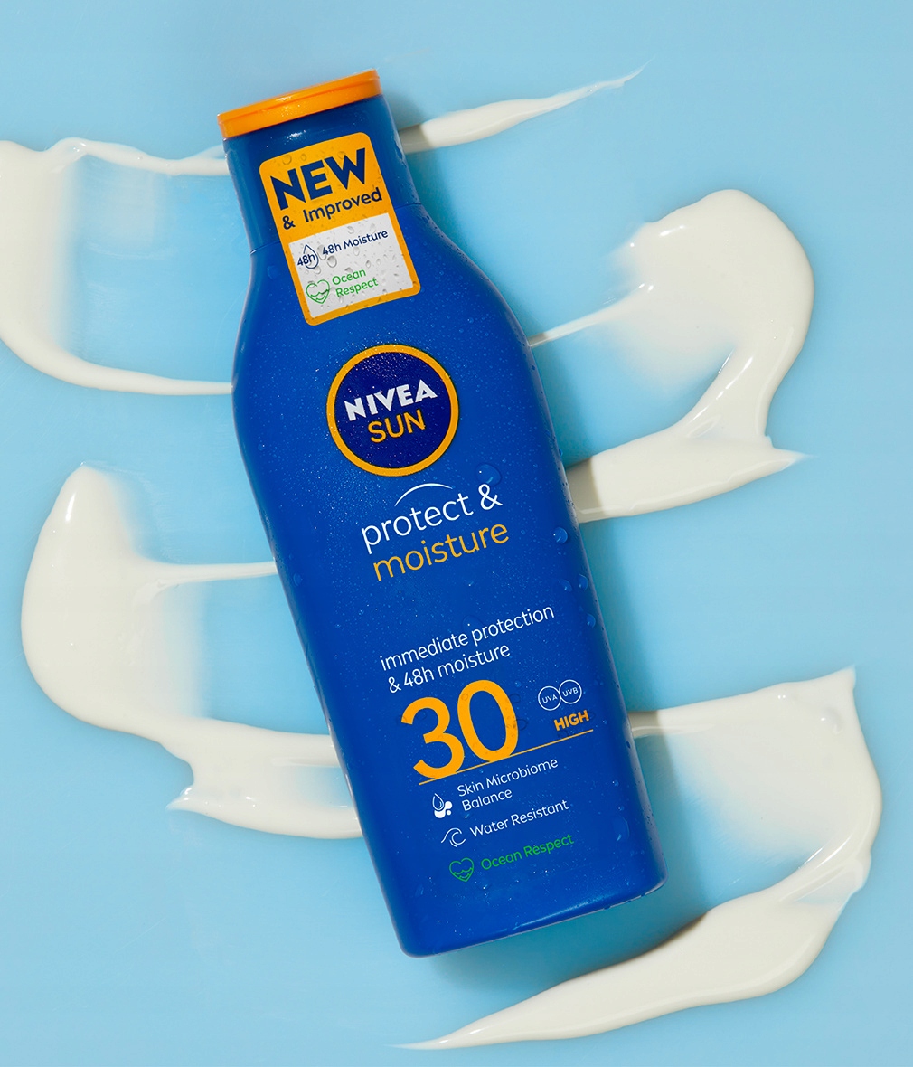 Balsam do opalania NIVEA SUN Protect & Moisture to wyjątkowa formuła, łącząca 2 funkcje: 1) wysoką ochronę dla skóry dzięki zawartości skutecznych filtrów UVA/UVB SPF 30, 2) 48-godzinne nawilżenie dla skóry, aby wyglądała zdrowo! Balsam do opalania natychmiastowo chroni przed poparzeniem, uszkodzeniem skóry jak i jej przedwczesnym starzeniem się, wywołanym promieniowaniem słonecznym.