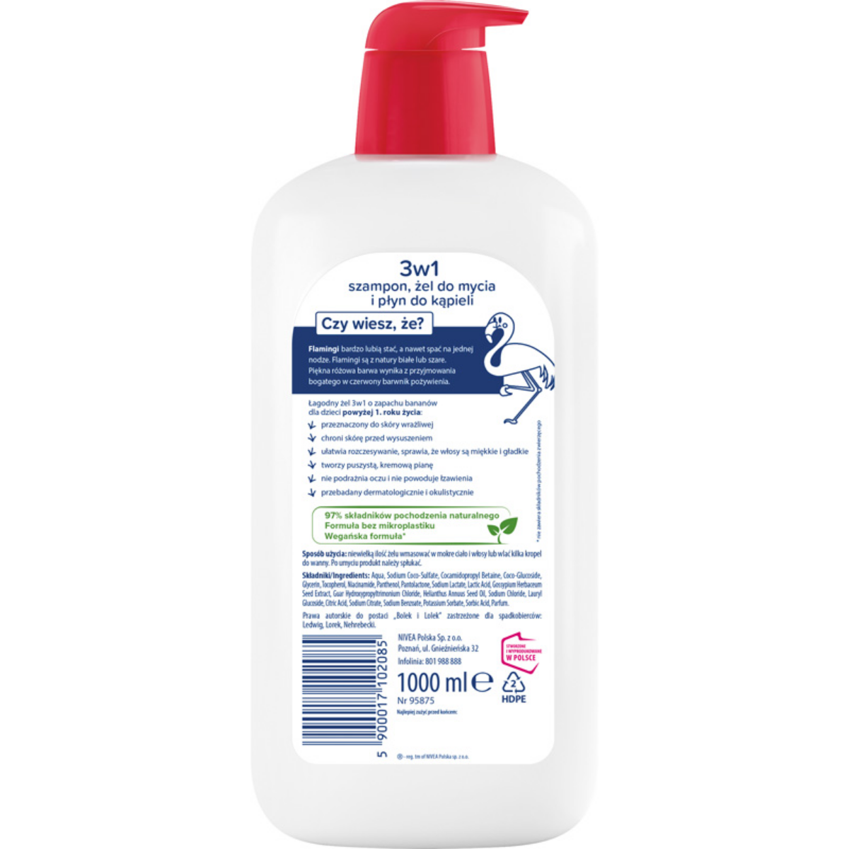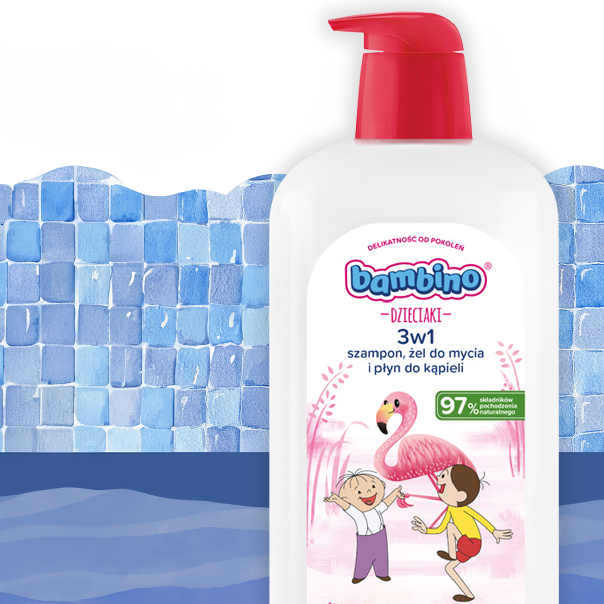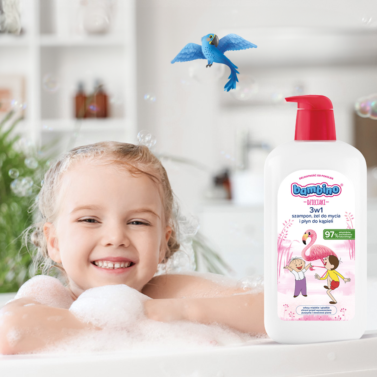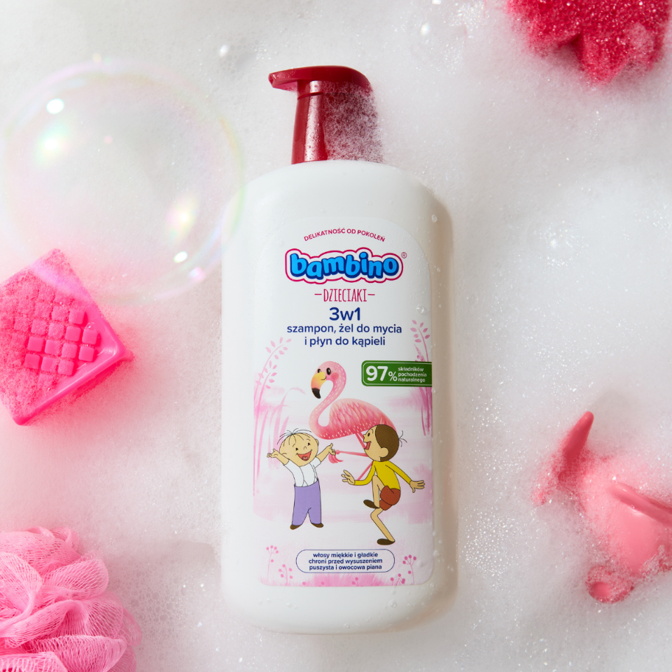 Bambino Dzieciaki 3w1 Flaming w dużej, rodzinnej pojemności 1000 ml to jeszcze więcej radości, piany i delikatności podczas codziennej kąpieli. Ten hiperdelikatny kosmetyk 3w1 łączy działanie szamponu, żelu do mycia i płynu do kąpieli, dzięki czemu świetnie sprawdza się w pielęgnacji dzieci powyżej 1. roku życia. Formuła opracowana z myślą o skórze wrażliwej skutecznie oczyszcza, a jednocześnie chroni skórę przed wysuszeniem, pozostawiając ją miękką i przyjemną w dotyku. Skład wzbogacony o pantenol, glicerynę i betainę intensywnie nawilża, zmiękcza i wspiera funkcje ochronne skóry, a podczas mycia wyraźnie ułatwia rozczesywanie, dzięki czemu włosy są miękkie i gładkie po każdym użyciu. W kontakcie z wodą kosmetyk zamienia się w puszystą, kremową pianę, a słodki bananowy zapach sprawia, że codzienna kąpiel staje się świetną zabawą i chwilą relaksu zarówno dla dziecka, jak i rodzica. Łagodna formuła nie szczypie w oczy i nie powoduje łzawienia, co jest szczególnie ważne u małych dzieci, które nie lubią kontaktu piany z okolicą oczu. Aż 97% składników pochodzenia naturalnego oraz fakt, że produkt jest przebadany dermatologicznie i okulistycznie, gwarantują bezpieczeństwo stosowania nawet przy bardzo wrażliwej skórze. Duże, praktyczne opakowanie 1000 ml to idealne rozwiązanie dla rodzin, które lubią produkty wydajne, wygodne i pewne — tak delikatne, jak potrzebują tego mali odkrywcy.