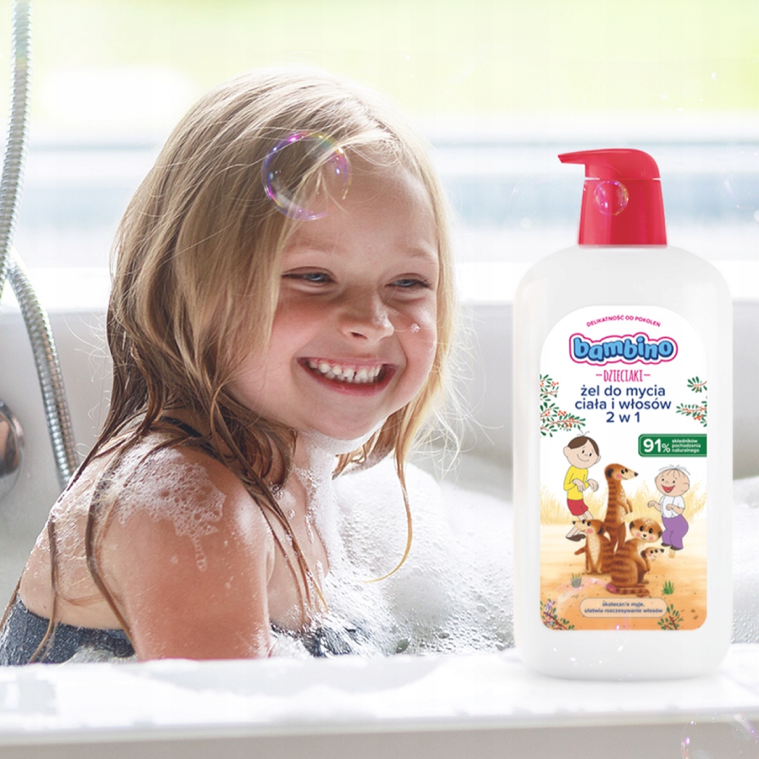 Żel 2 w 1 zarówno chroni skórę przed wysuszeniem i myje włosy, pozostawiając je czyste i miękkie. Dodatkowo, nie powoduje łzawienia oczu. Delikatny żel Bambino to produkt do kąpieli dziecka i mycia włosów w jednym – dzięki niemu ochronisz wrażliwą skórę dziecka przed wysuszeniem i zadbasz o jego „czuprynkę”.