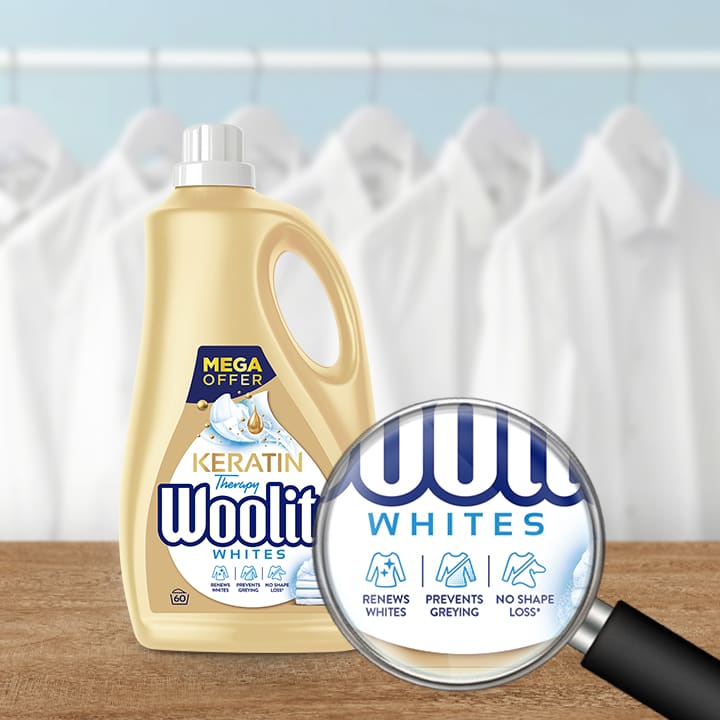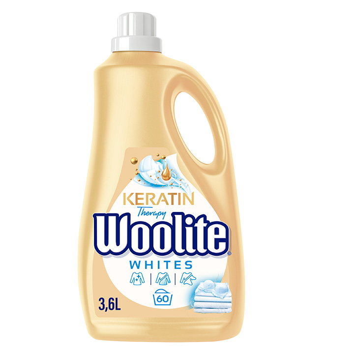 Twoje białe ubrania żółkną lub szarzeją z każdym praniem?Z płynem do prania Woolite zatrzymasz blask bieli na dłużej! Nowy Woolite Keratin Therapy to płyn do codziennego prania wszystkich rodzajów ubrań, który sprawia, że Twoje jasne ubrania dłużej wyglądają nieskazitelnie.