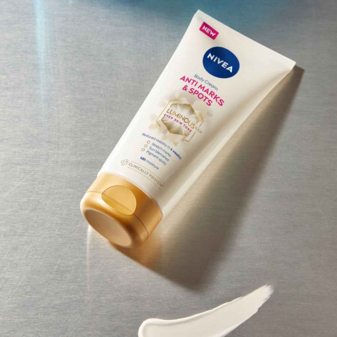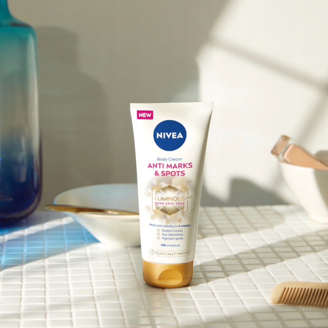 Pożegnaj się z rozstępami, przebarwieniami posłonecznymi i plamami pigmentacyjnymi z kremem do ciała NIVEA Luminous630 Anti Marks & Spots.