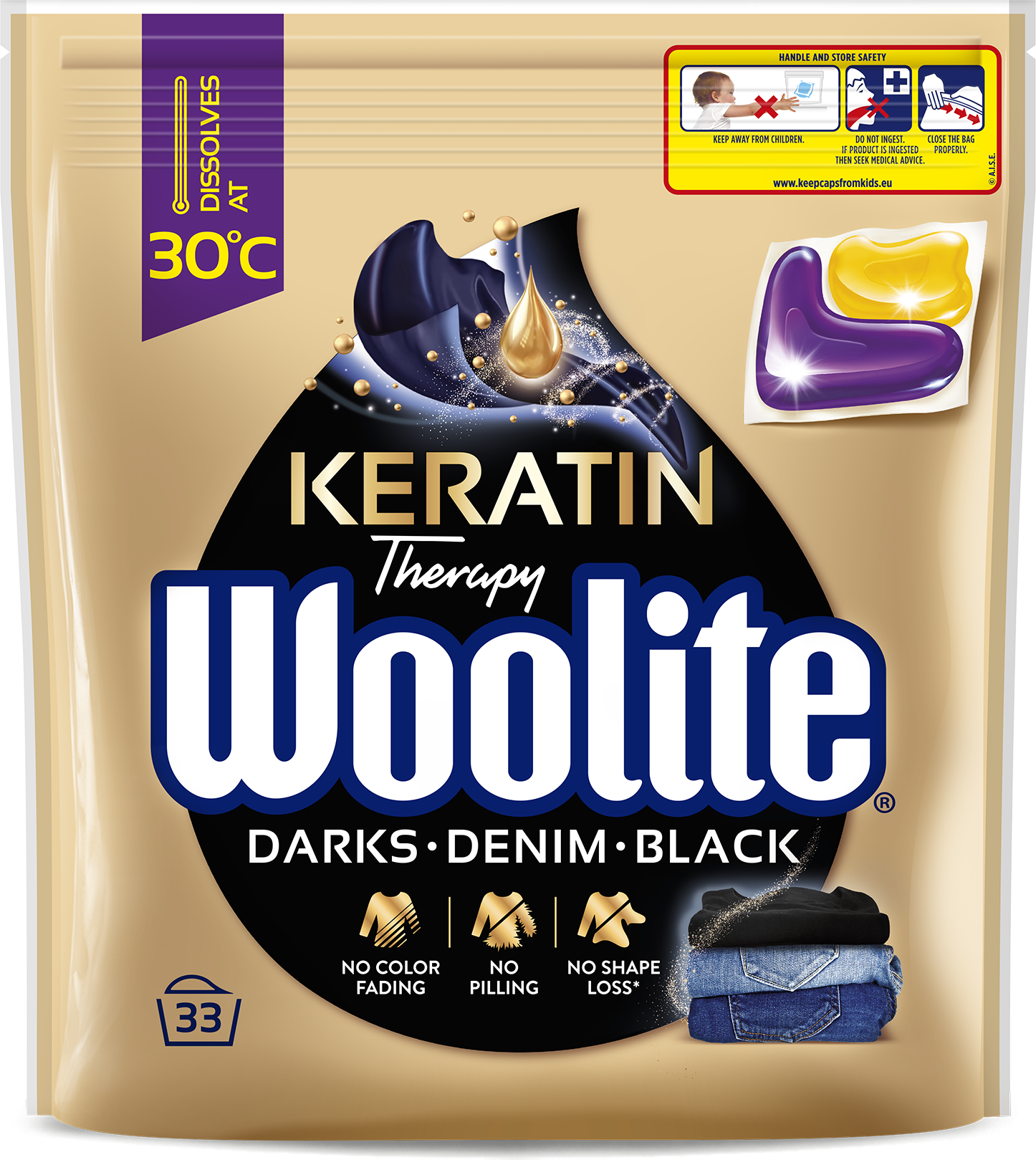 Woolite umożliwia jeszcze skuteczniejsze dbanie o tkaniny, wprowadzając na rynek produkty do prania z keratyną słynącą z wyjątkowych właściwości pielęgnacyjnych włosów. Keratyna dba o nie i je regeneruje, wykazując świetne właściwości ochronne, nawilżające i wygładzające. Z tego względu jest chętnie wykorzystywana przez największych światowych producentów kosmetyków do pielęgnacji włosów.Ciesz się nieskazitelnym wyglądem czerni i ciemnych ubrań dłużej niż kiedykolwiek wcześniej. Zadbaj o piękno swoich ubrań z Woolite! Kapsułki czy płyn do prania?