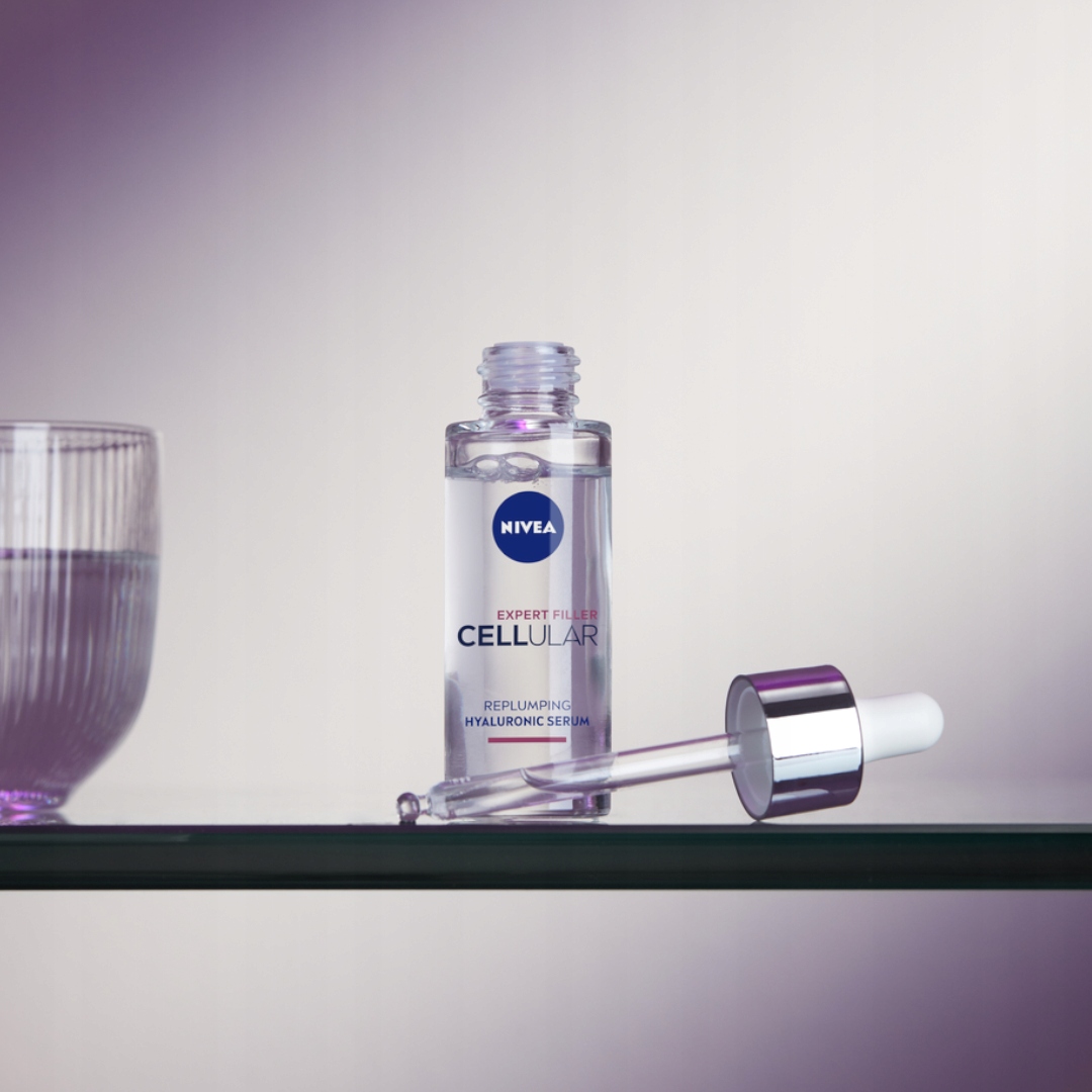 NIVEA® CELLULAR EXPERT FILLER WYPEŁNIAJĄCE SERUM HIALURONOWE zawiera Kwas Hialuronowy, który aktywuje komórki*, by niwelować oznaki starzenia się skóry. Dzięki lekkiej formule szybko się wchłania i nie pozostawia uczucia lepkości na skórze. Serum zawiera 20% Eliksiru nawilżającego: