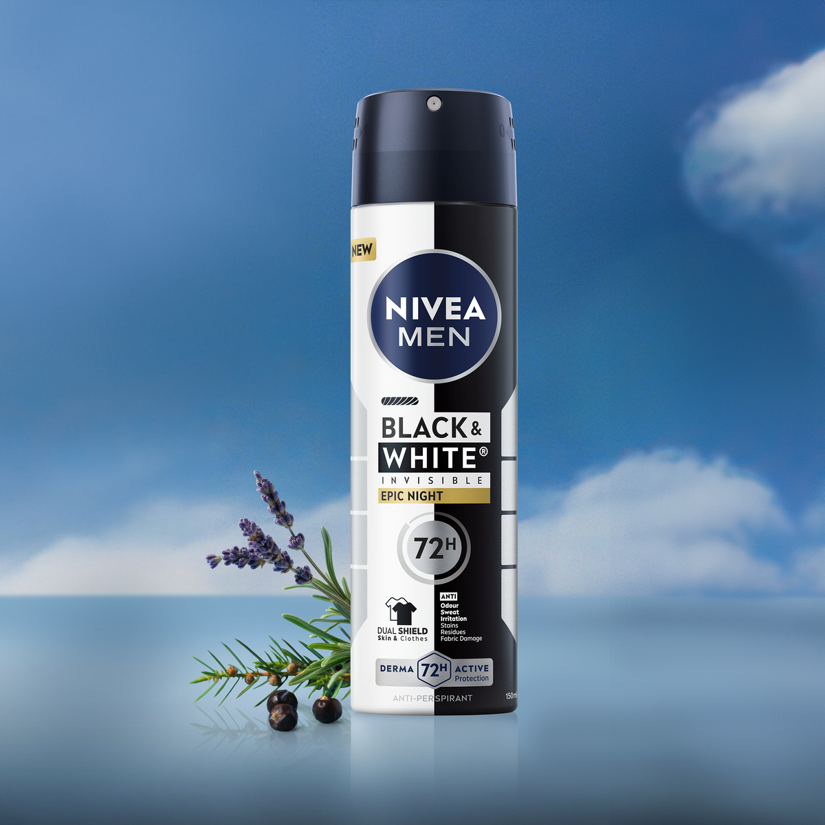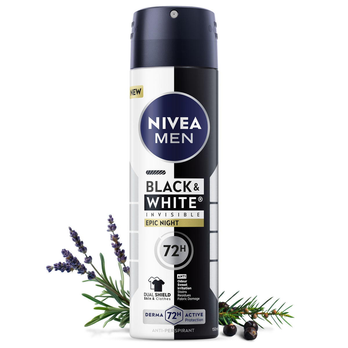 Postaw na bezkompromisową ochronę swojej skóry i garderoby dzięki antyperspirantowi w sprayu NIVEA MEN Black&White Invisible Epic Night. Zastosowana w nim zaawansowana technologia Dual Shield tworzy niezawodną barierę, która skutecznie chroni przed powstawaniem żółtych plam na białych koszulach oraz białych śladów na ciemnych ubraniach. Ten antyperspirant gwarantuje aż 72-godzinną ochronę przed potem i przykrym zapachem, pozostając jednocześnie wyjątkowo łagodnym dla skóry pod pachami. Męski, chłodzący aromat dezodorantu zapewnia natychmiastowe orzeźwienie, a wygoda, którą zapewnia antyperspirant w sprayu umożliwia błyskawiczną i precyzyjną aplikację w każdych warunkach. NIVEA MEN Black&White Invisible Epic Night jest doskonałym wyborem do codziennej, intensywnej pielęgnacji. To pewność siebie i nienagannego wyglądu Twoich ubrań! Tolerancja dla skóry potwierdzona dermatologicznie.- Ochrona przed żółtymi i białymi śladami na ubraniach.