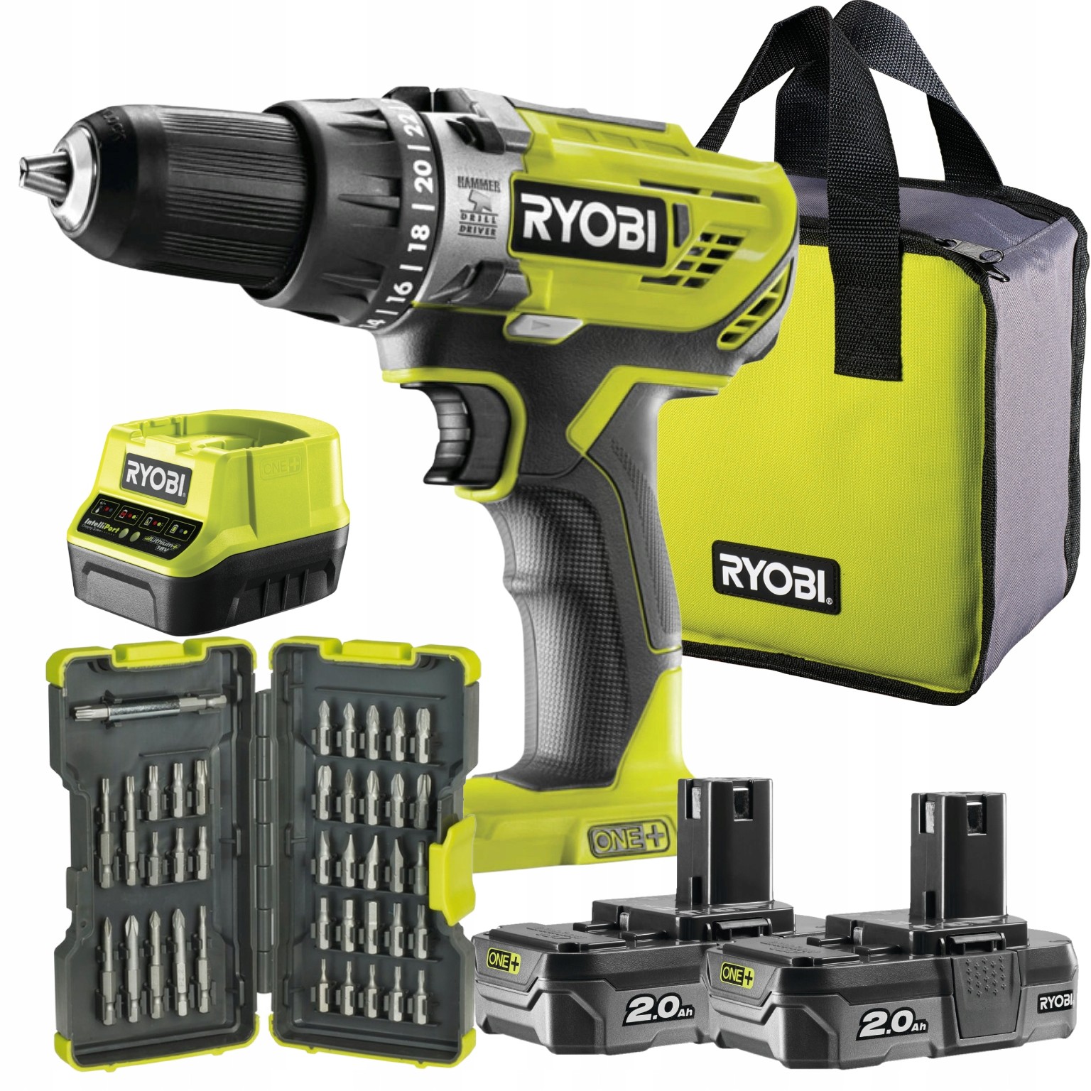 RYOBI Wiertarko-wkrętarka udarowa 18V (2x2.0AH) + RYOBI Zestaw bitów 40 szt
