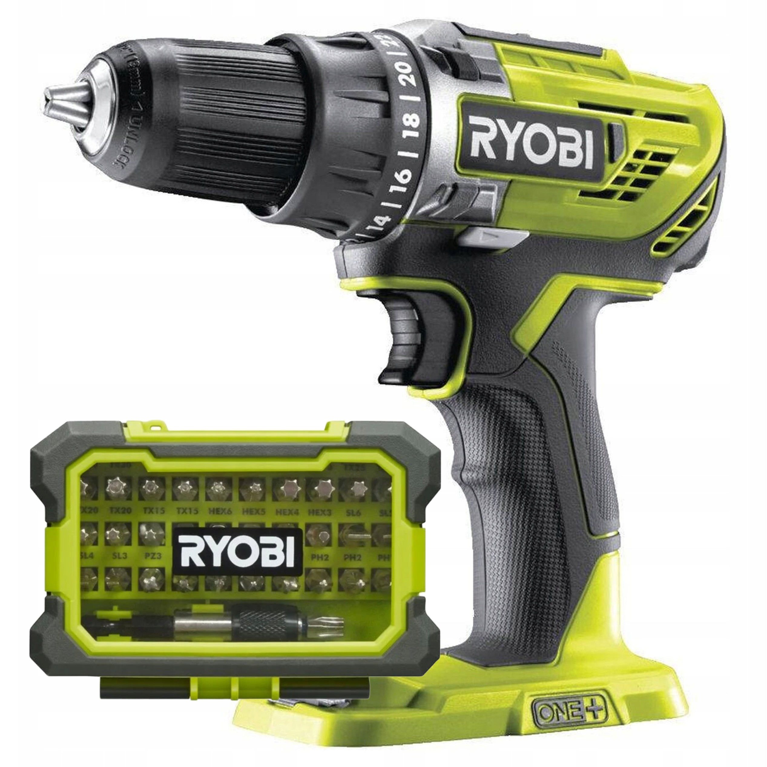 RYOBI Wiertarko-wkrętarka 18V R18DD3-0 + RYOBI Zestaw 32 szt. bitów