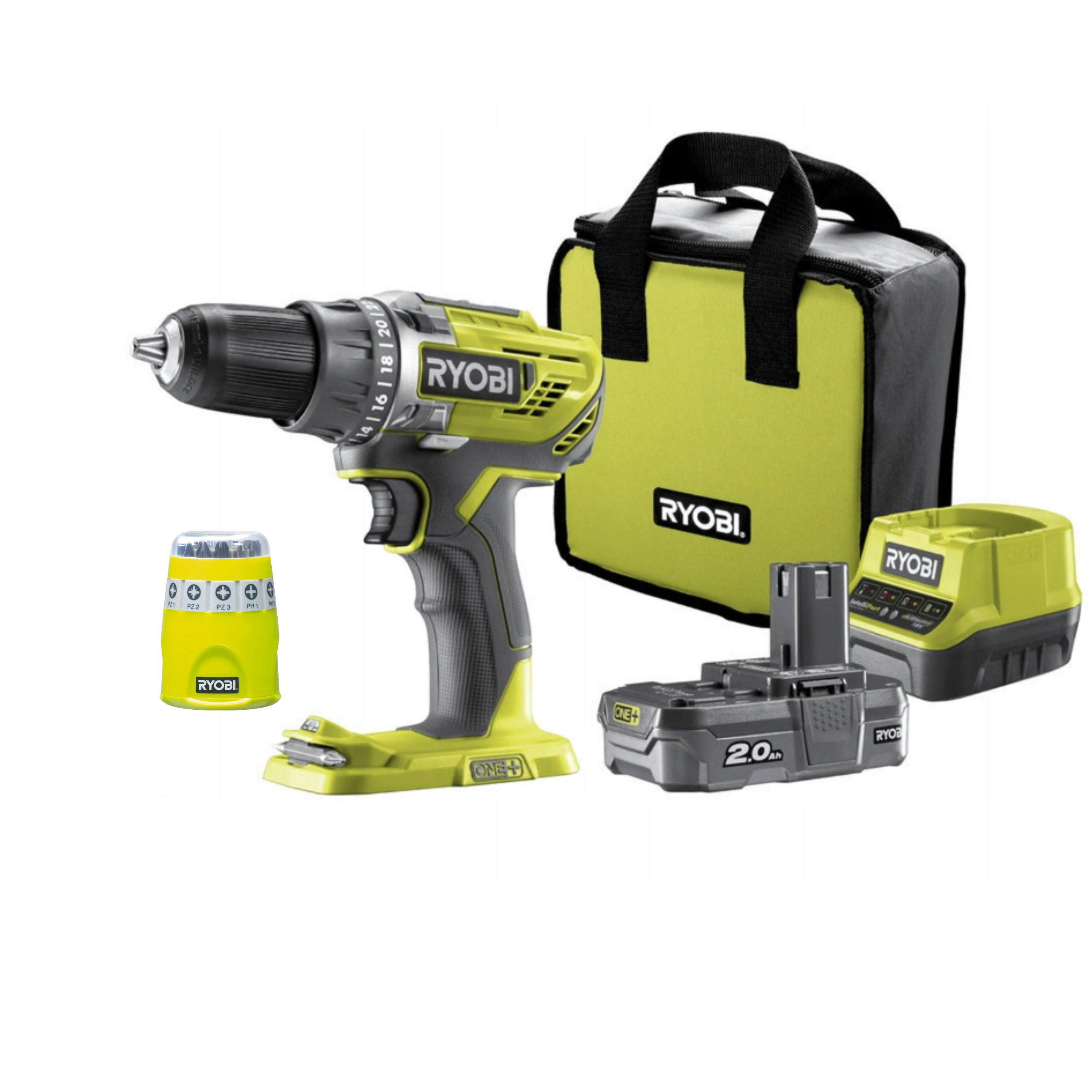 RYOBI Wiertarko-wkrętarka ONE+ 18V + Zestaw bitów 10 szt + Akumulator 2.0Ah