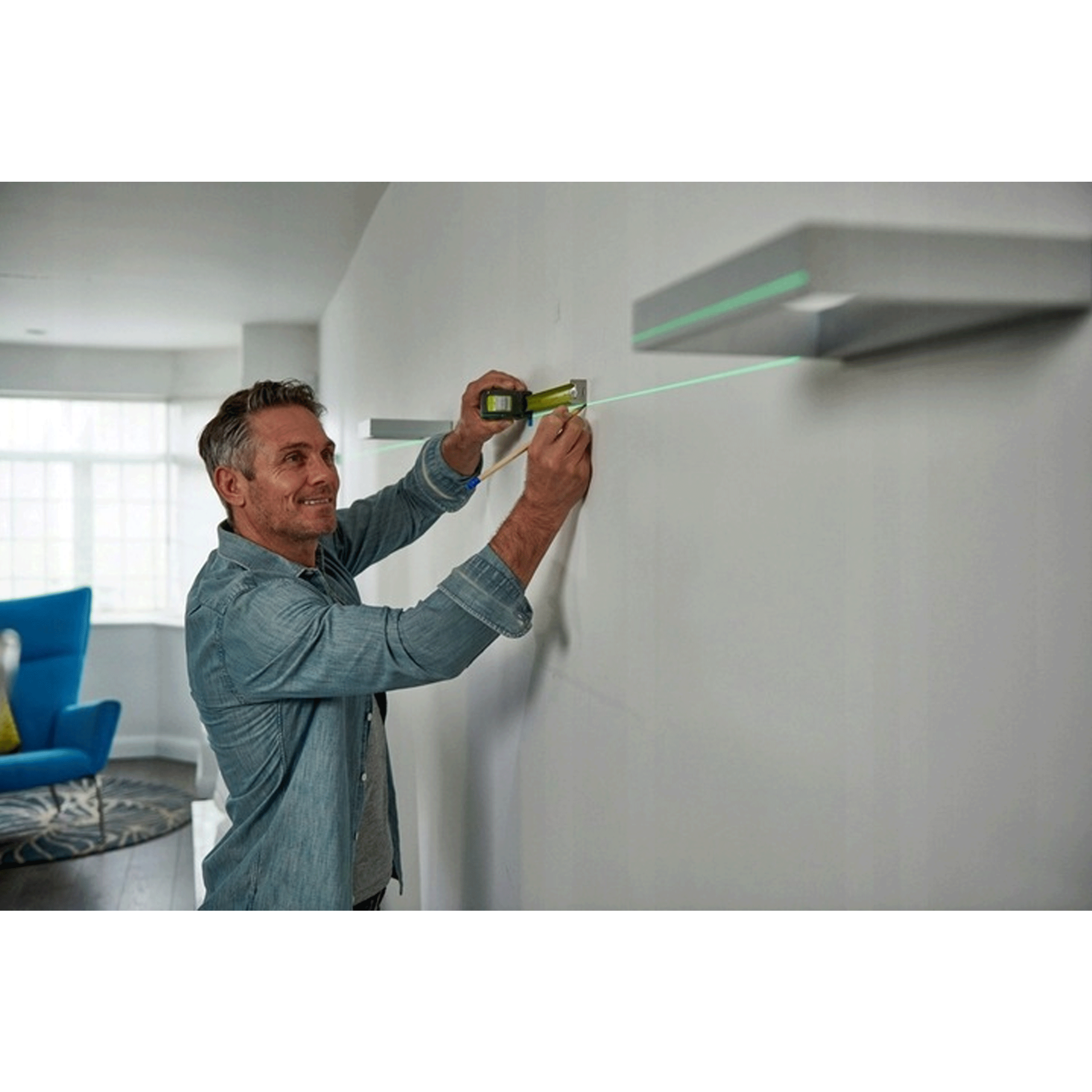Zielony laser liniowy RB360GLL Ryobi jest bardzo dobrze widoczny w każdych warunkach. Doskonale sprawdza się do wieszania półek czy desek na tej samej wysokości, ale na kilku ścianach, gdyż emituję wiązkę 360°. Urządzenie oferuje również emitowanie jednej wiązki, w razie gdy zajdzie taka potrzeba. Funkcja samopoziomowania usprawnia użytkowanie - o odpowiednim wypoziomowaniu informuje dioda LED. Obudowa pokryta gumą chroni urządzenie przed uszkodzeniami mechanicznymi. Kompaktowa konstrukcja pozwala wygodnie przenosić i przechowywać model.Charakterystyka produktu: