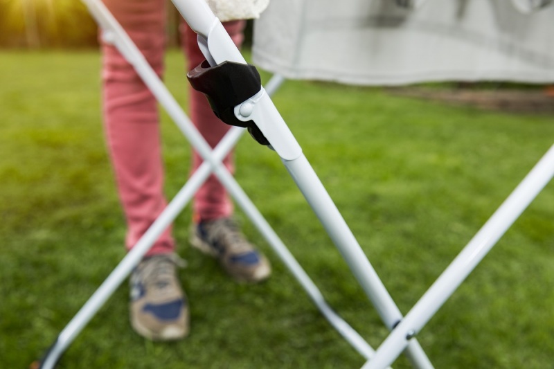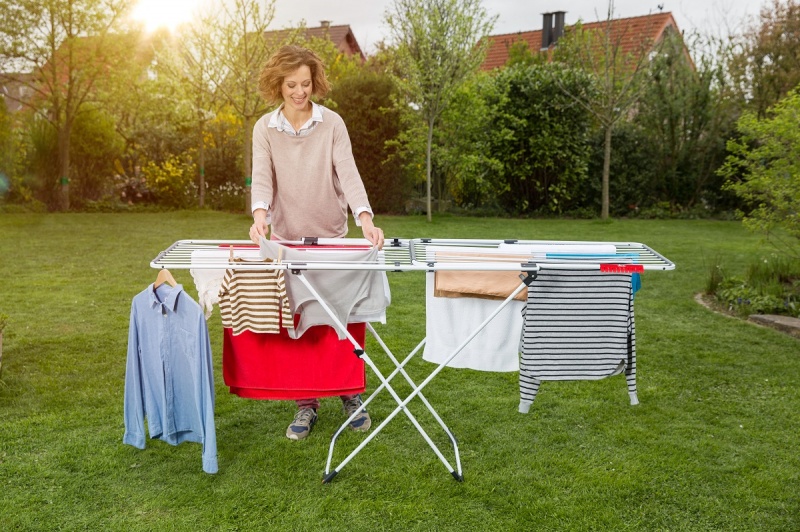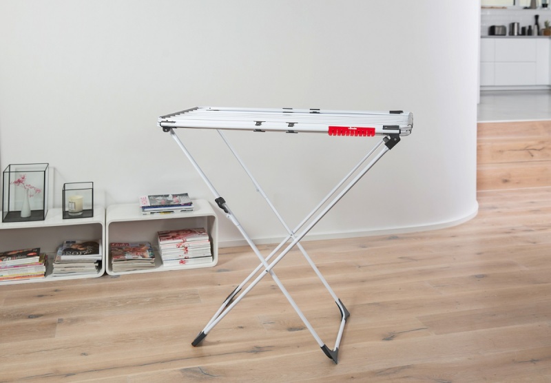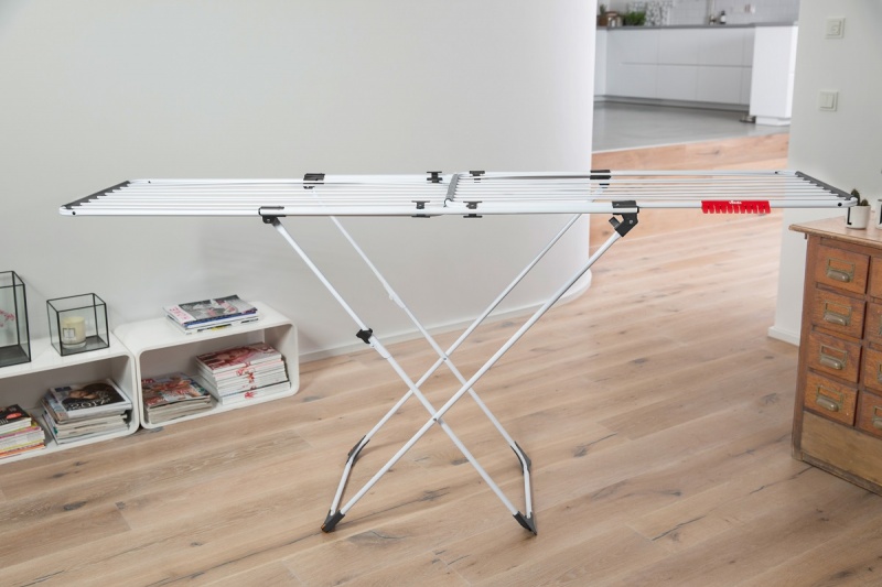 Rozsuwana suszarka Doble z nakładającymi się ramionami i linkami zapobiegającymi zagnieceniom. 2 niezależne nachodzące na siebie stelaże. Wszechstronność zapewnia jej regulacja długości od 105 cm do 209 cm. Dzięki grubym drutom zapobiega powstawaniu zagnieceń na częściach garderoby jednocześnie skracając proces prasowania.