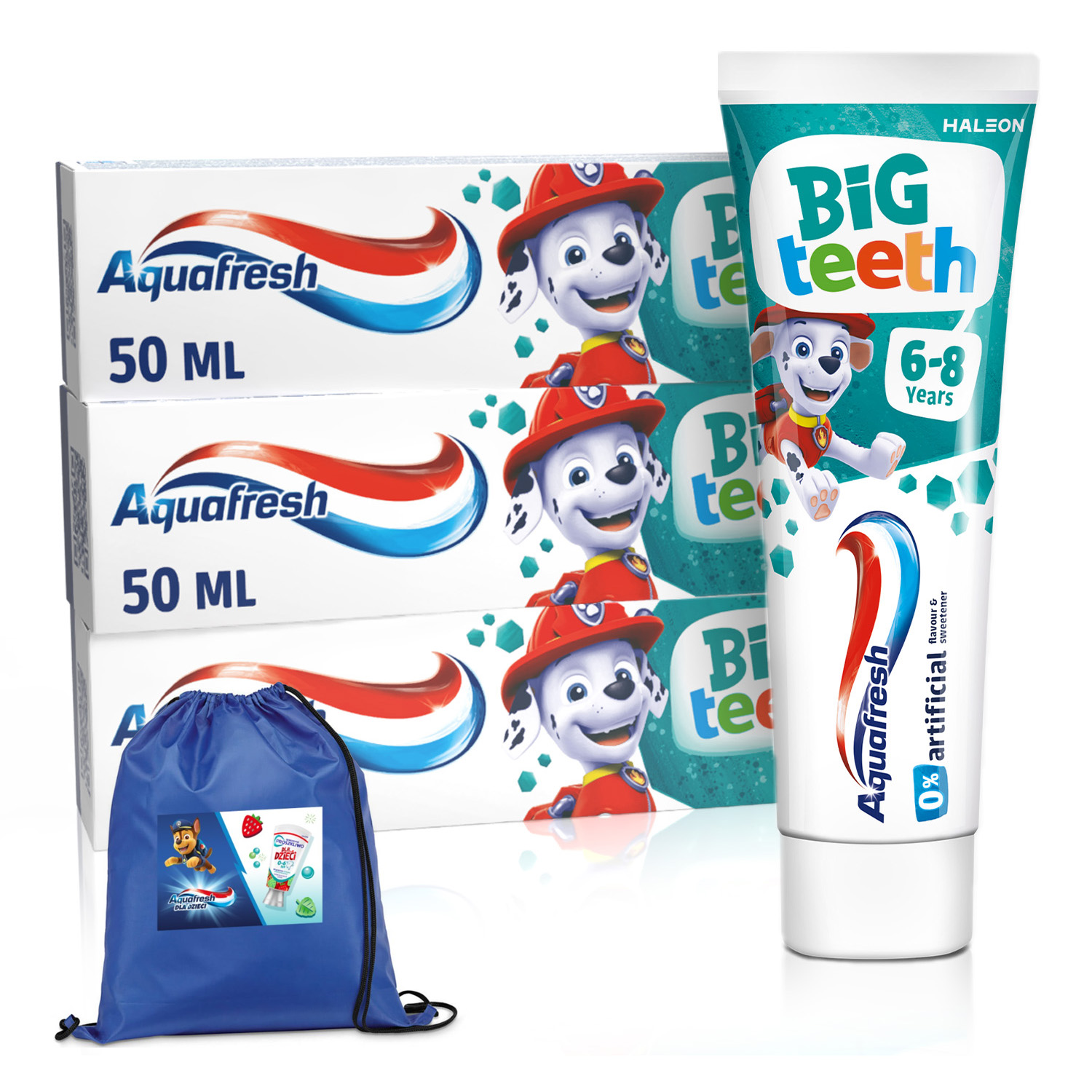 AQUAFRESH BIG TEETH PASTA DO ZĘBÓW 6-8 LAT PSI PATROL 50ml x3 + Plecak