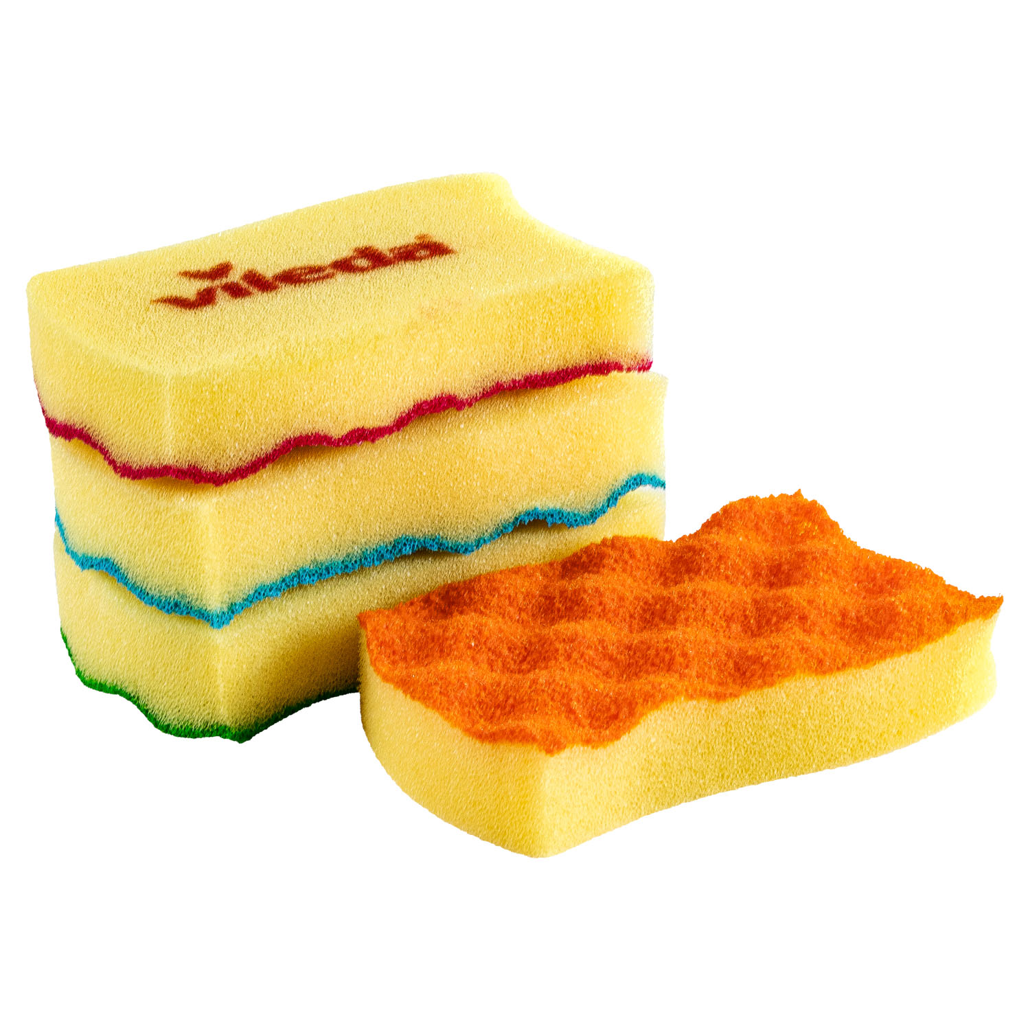 Opakowanie zawiera cztery zmywaki w żywych i świeżych kolorach. Każdy kolor można przypisać do innego zadania – niebieski do kuchni, pomarańczowy do łazienki a zielony np. do zastosowania na zewnątrz