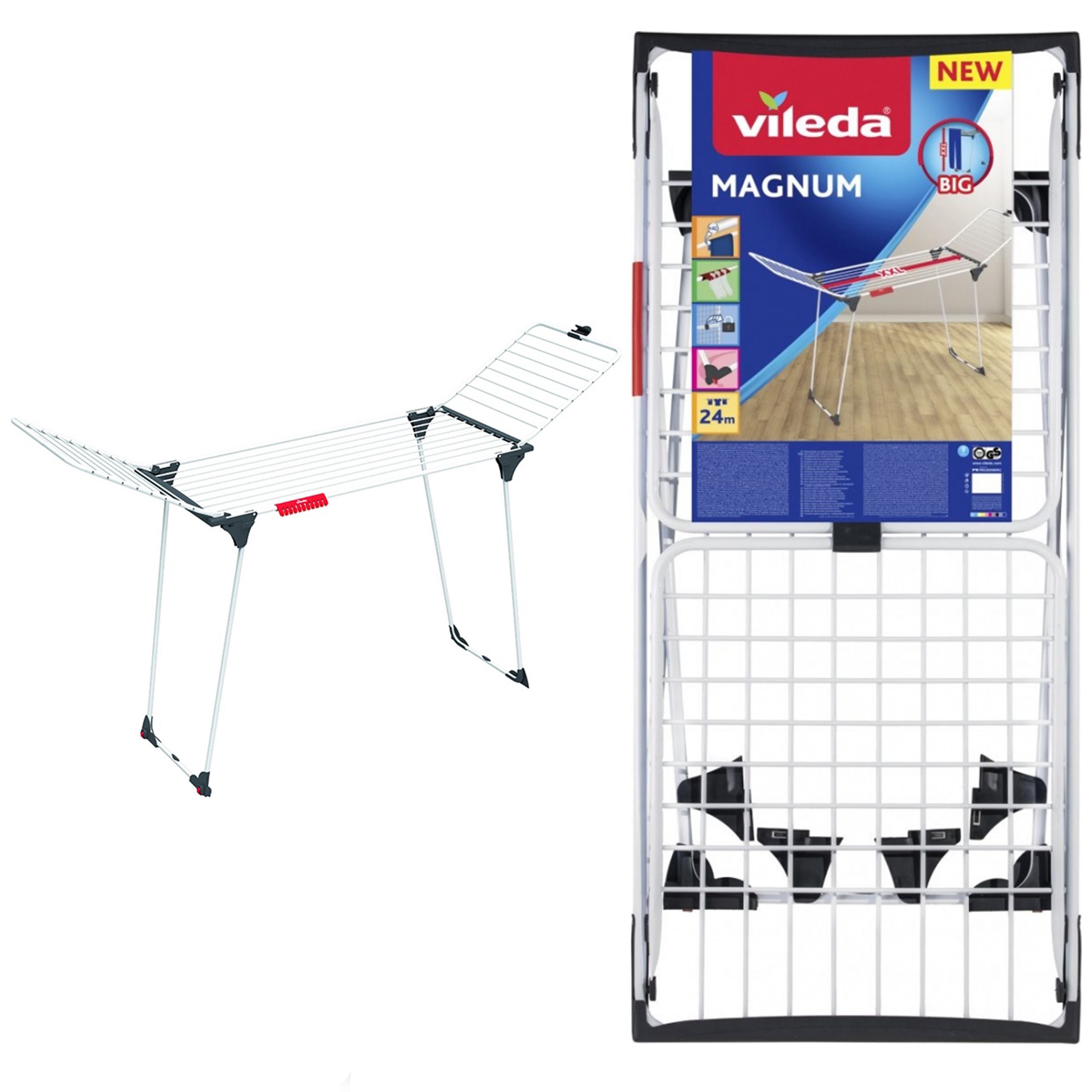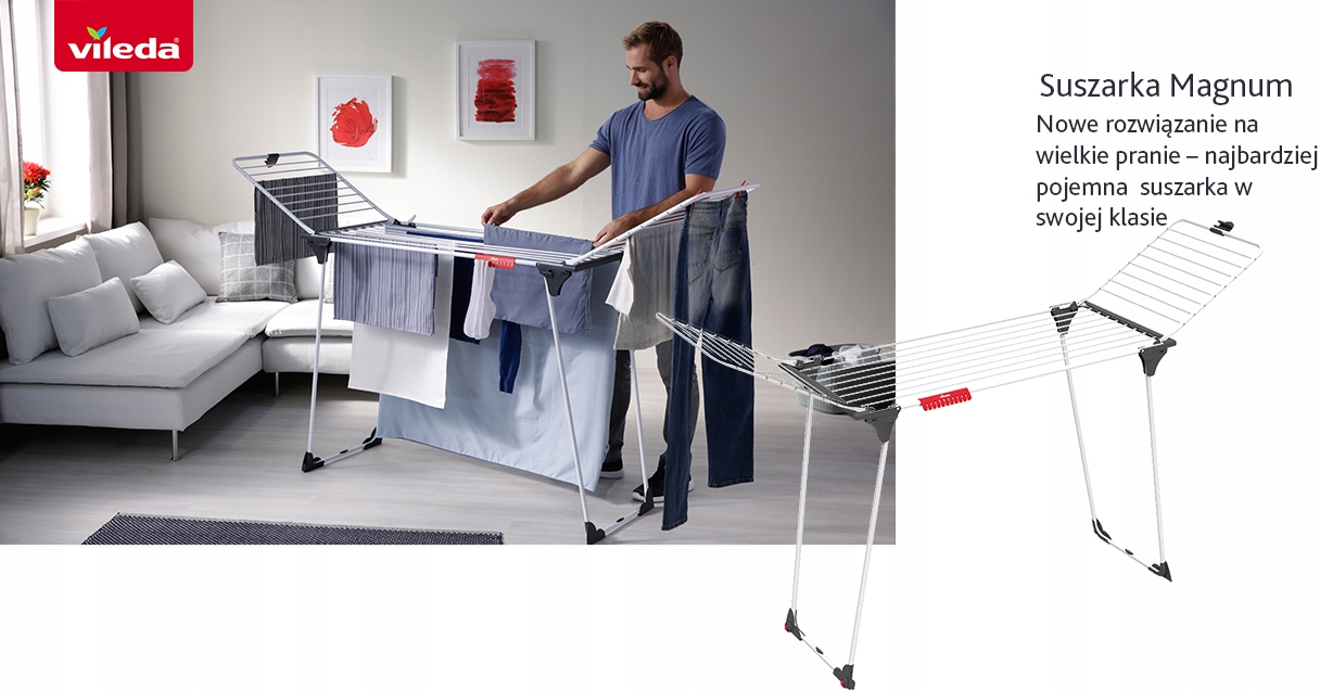 Suszarka do prania jest niezbędnym akcesorium w każdym domu. Suszarka Vileda Magnum jest praktycznym i inteligentnym rozwiązaniem dla Twojego prania. Produkt oferuje extra dużą powierzchnię suszenia, stabilność i łatwe suszenie.Grube aluminiowe druty zapobiegają gnieceniu prania. Suszarka na pranie jest solidna i stabilna dzięki bezpiecznym i trwałym nogom. Dużą zaletą są kółka, zamykanie skrzydeł i uchwyt na małe przedmioty, który umożliwi łatwe i szybkie zawieszenie skarpet lub bielizny bez potrzeby klamerek.