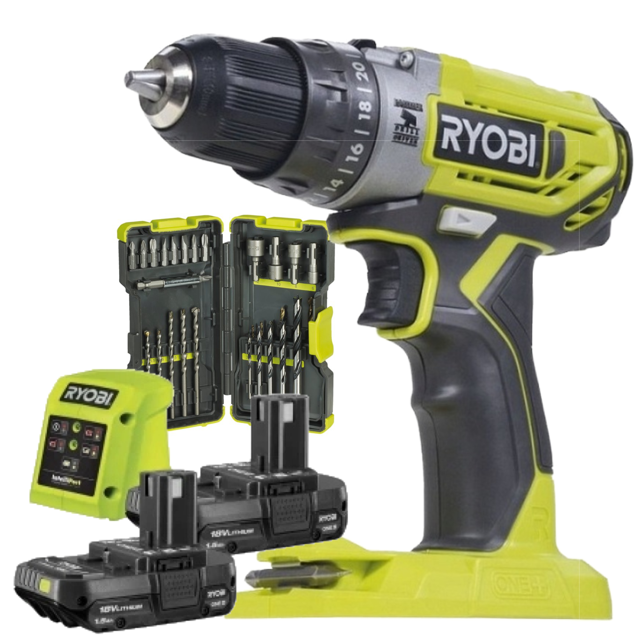 Ryobi Wiertarko-Wkrętarka Udarowa 18v 2x1.5ah Ładowarka+Zestaw bitów 30 szt