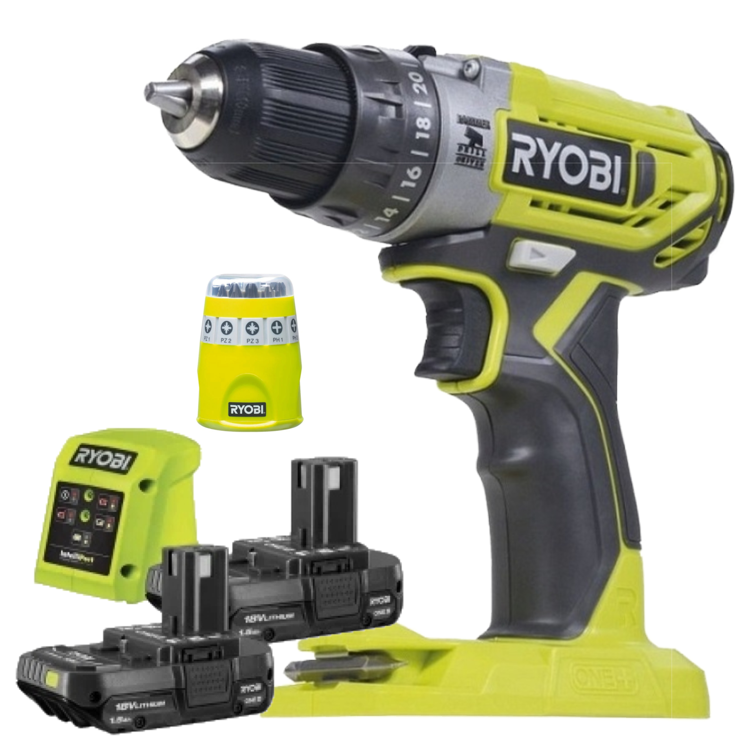 Ryobi Wiertarko-Wkrętarka Udarowa 18v 2x1.5ah Ładowarka+Zestaw bitów 10 szt