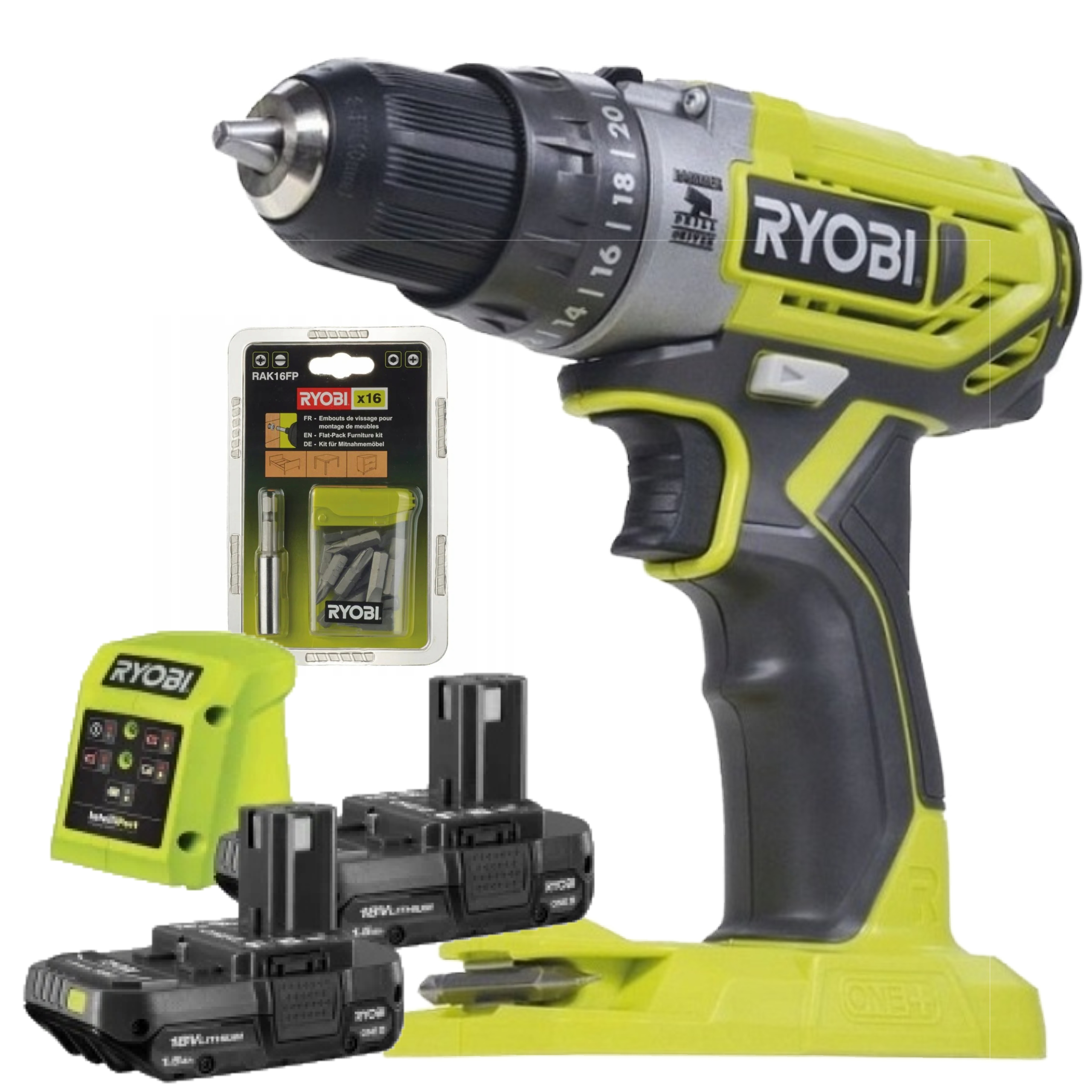 Ryobi Wiertarko-Wkrętarka Udarowa 18v 2x1.5ah Ładowarka + Zestaw bitów 15el
