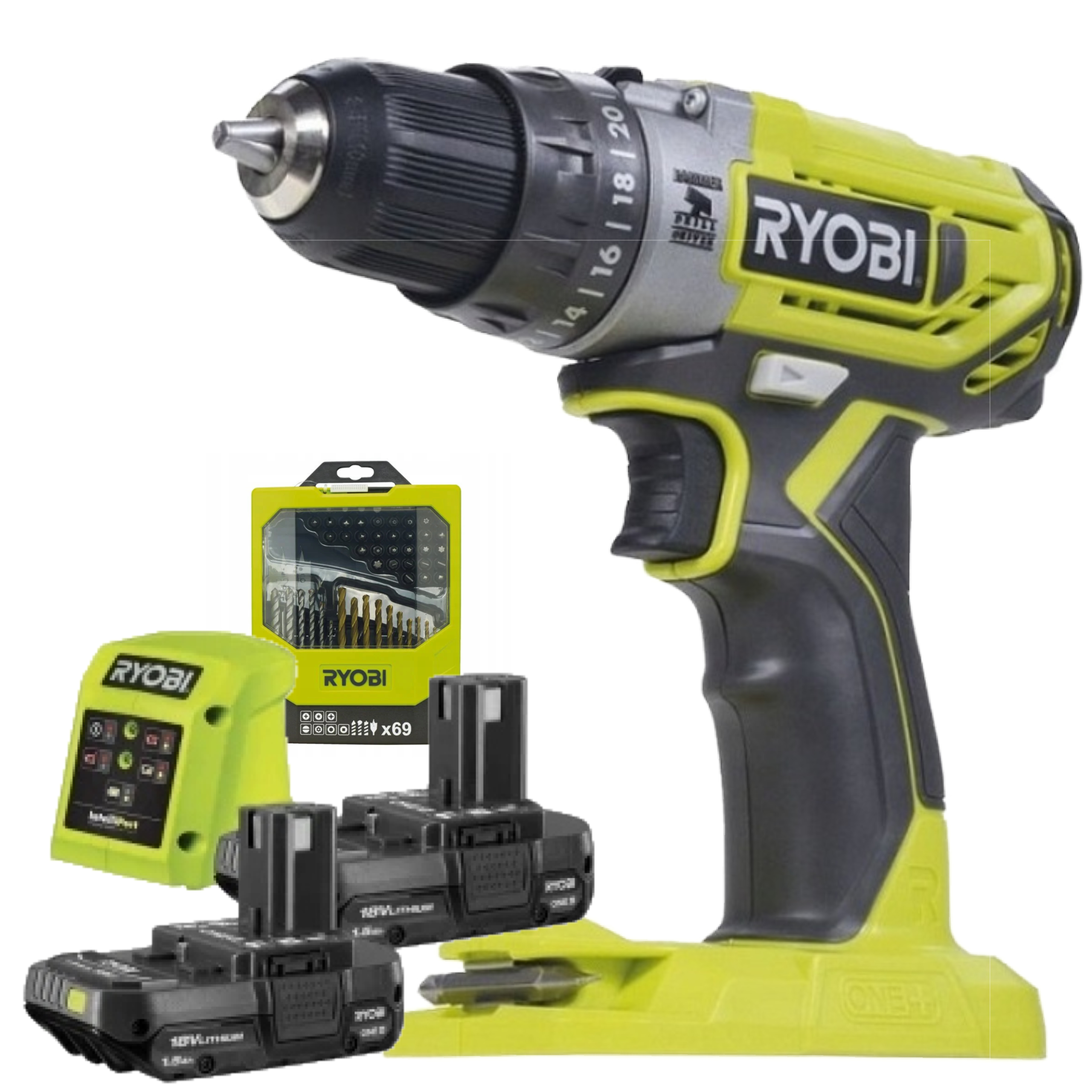 Ryobi Wiertarko-Wkrętarka Udarowa 18v 2x1.5ah Ładowarka+Zestaw bitów 69 szt