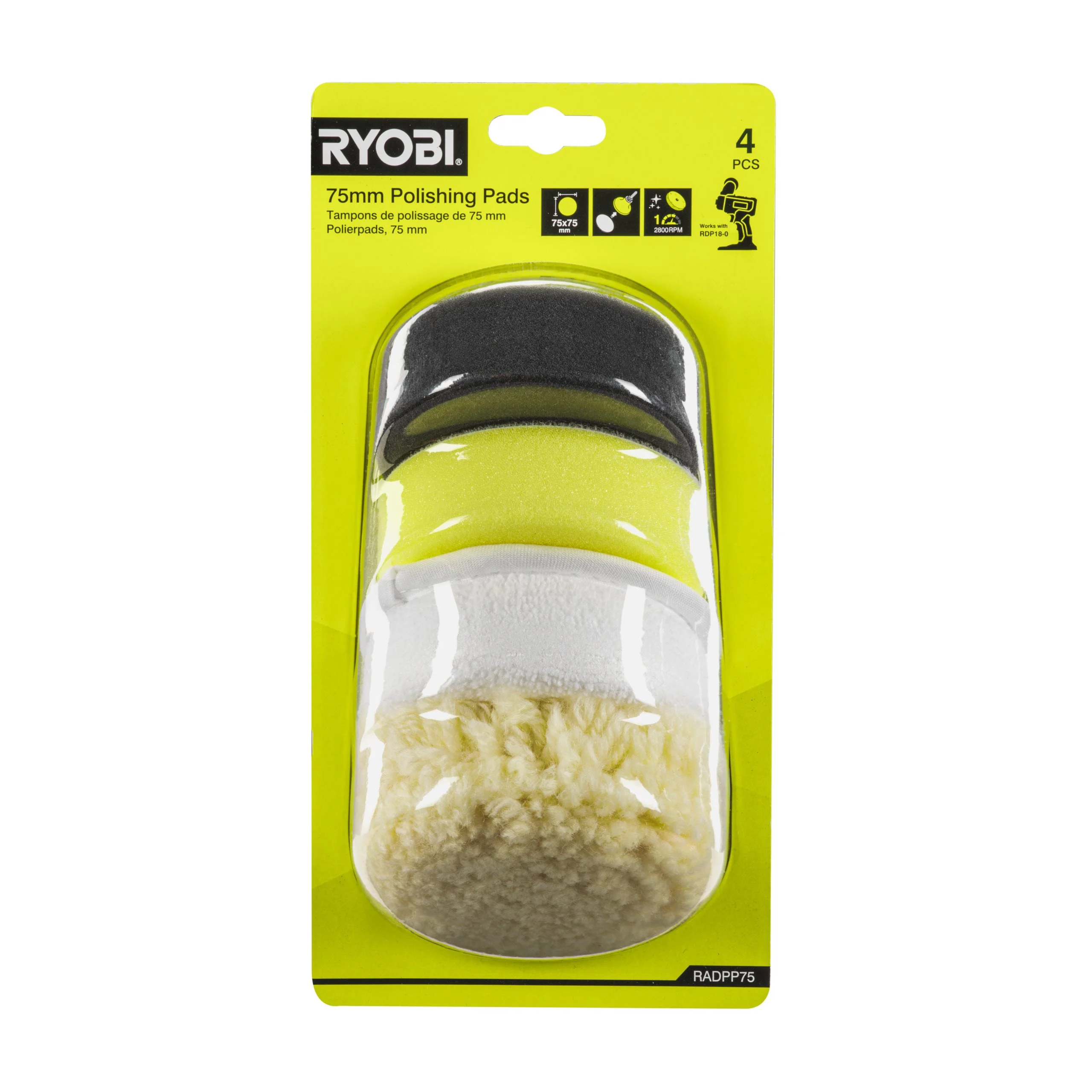 Zestaw padów polerskich RYOBI RADPP75 składa się z 4 sztuk padów o wymiarach 75x75 mm. Zestaw został zaprojektowany specjalnie do użytku z polerko-szlifierką Ryobi RDP18-0. Każdy pad posiada średnicę 75 mm, co zapewnia optymalne rozmiary do polerowania różnych powierzchni.