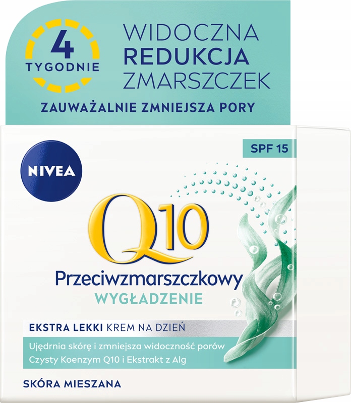 NIVEA Q10 Wygładzenie Przeciwzmarszczkowy ekstra lekki krem na dzień z SPF 15 ujędrnia skórę i zmniejsza widoczność porów jednocześnie redukując zmarszczki. Krem do twarzy zawiera najczystszy, identyczny jak w skórze Koenzym Q10, który zapewnia podwójną siłę działania. Chroni komórki skóry przed czynnikami zewnętrznymi oraz dodaje zastrzyk energii pomagając w procesie ich regeneracji*. Zawiera ekstrakt z alg, znany z właściwości antybakteryjnych. Normalizująca, lekka formuła z SPF 15 idealna do cery mieszanej zmniejsza widoczność porów, aby skóra wyglądała na naturalnie gładką.