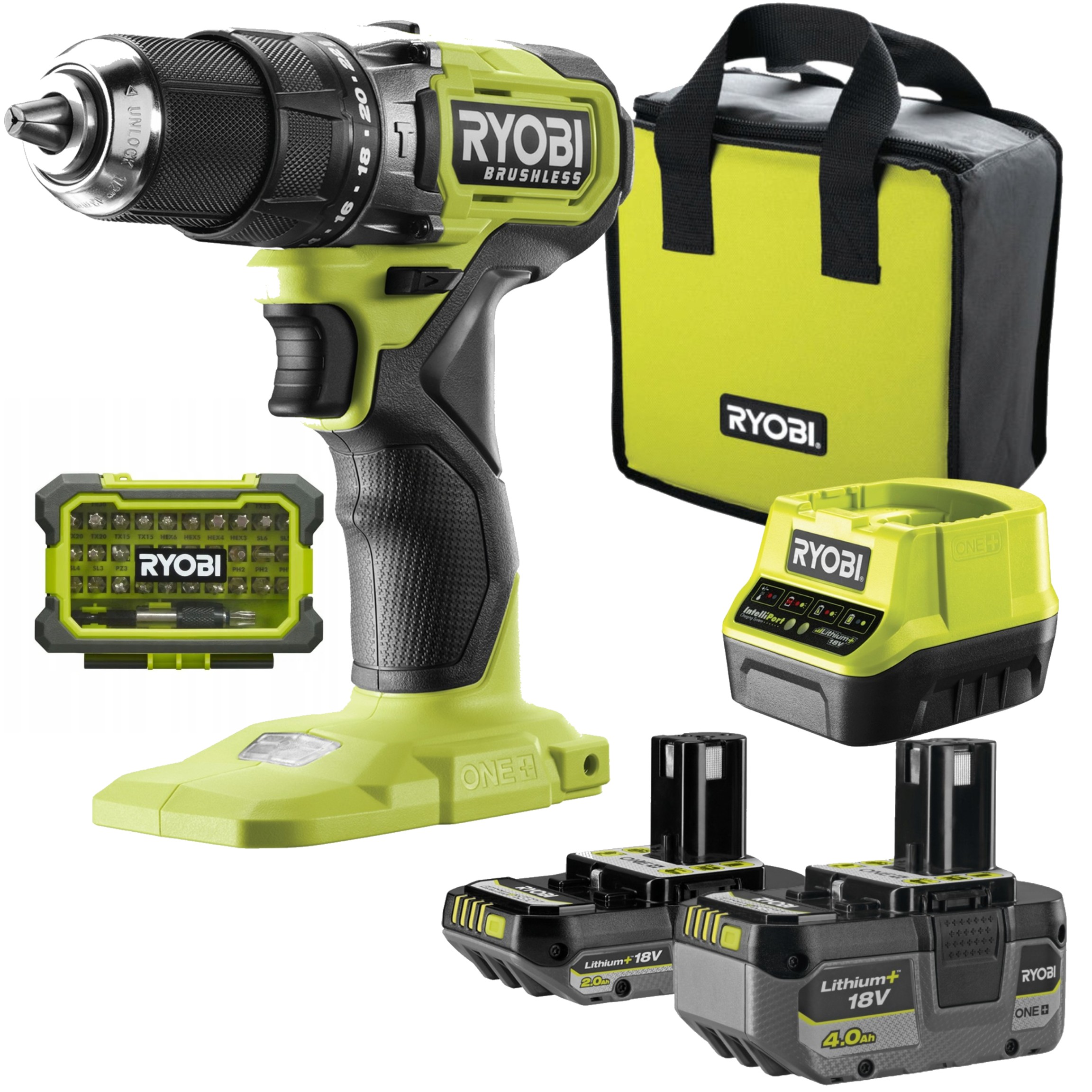 RYOBI WIERTARKO-WKRĘTARKA + Ładowarka + 4AH + 2AH + Zestaw 32 szt. bitów