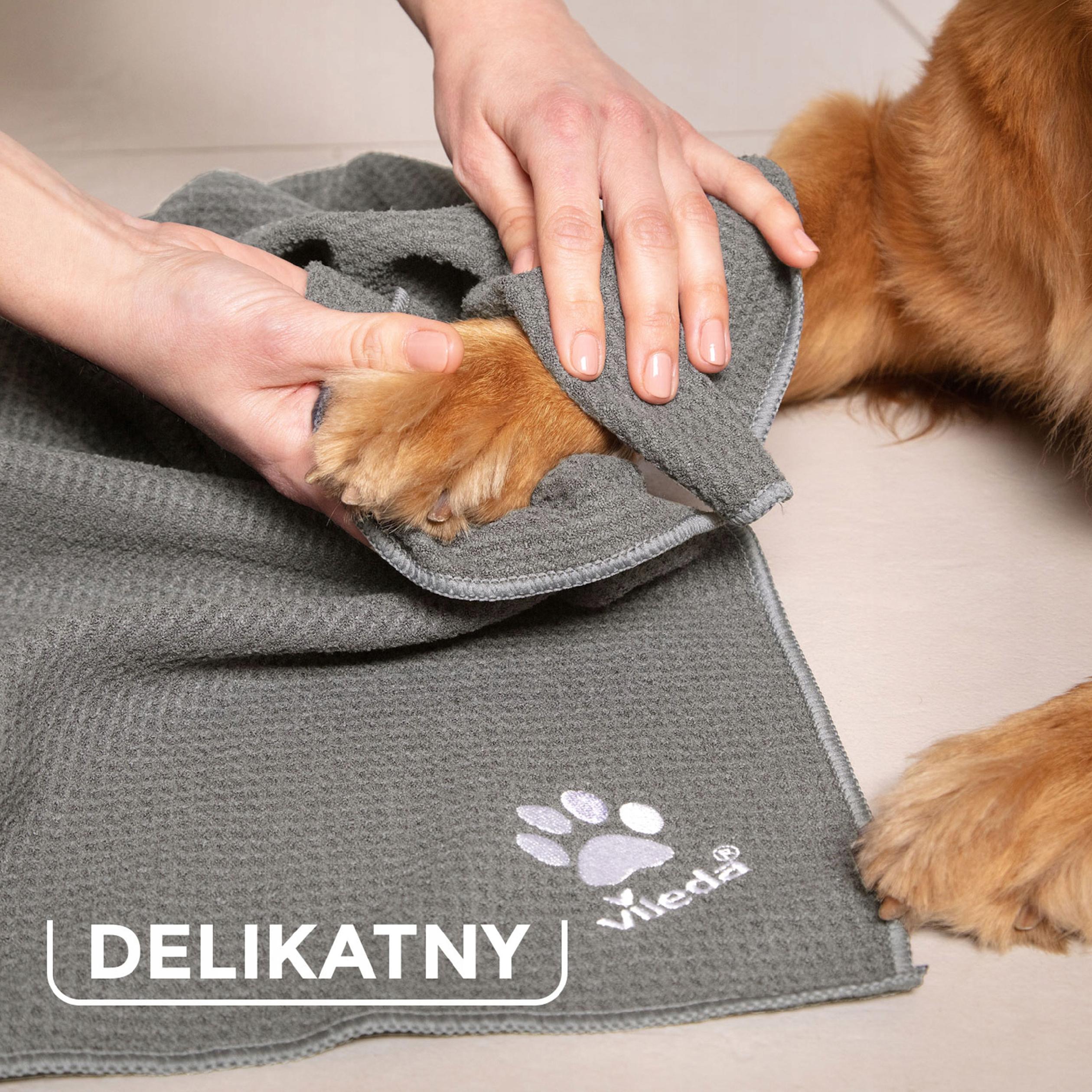 Ręcznik z mikrofibry Vileda Pet Pro w mgnieniu oka osusza i usuwa zabrudzenia z czworonogów.