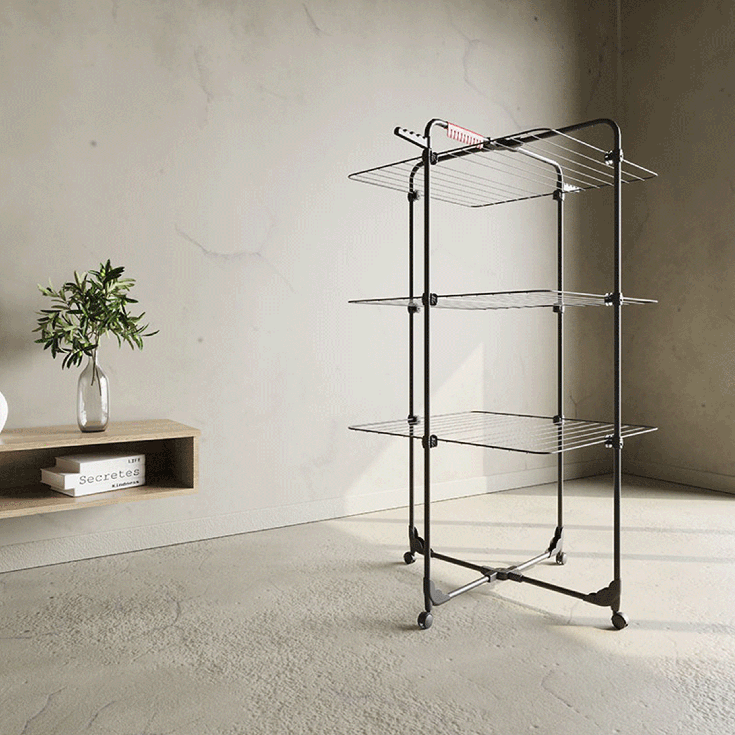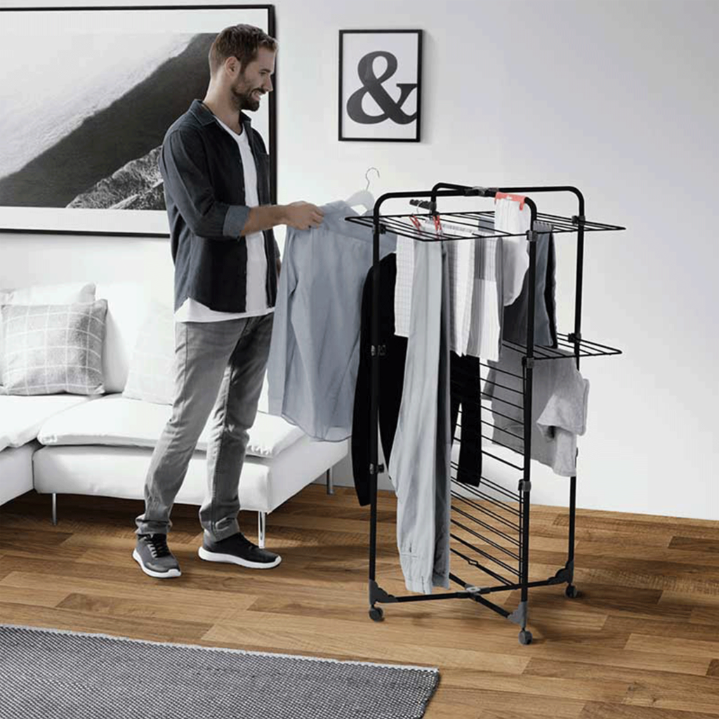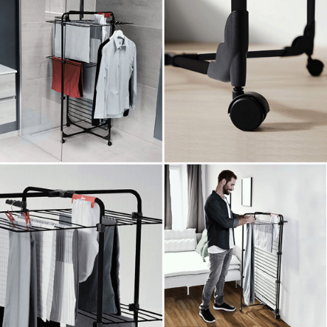 Idealne rozwiązanie do niedużych mieszkań. Matowy czarny kolor sprawia, że suszarka wygląda niezwykle nowocześnie i elegancko, a przy tym jest bardzo funkcjonalna
