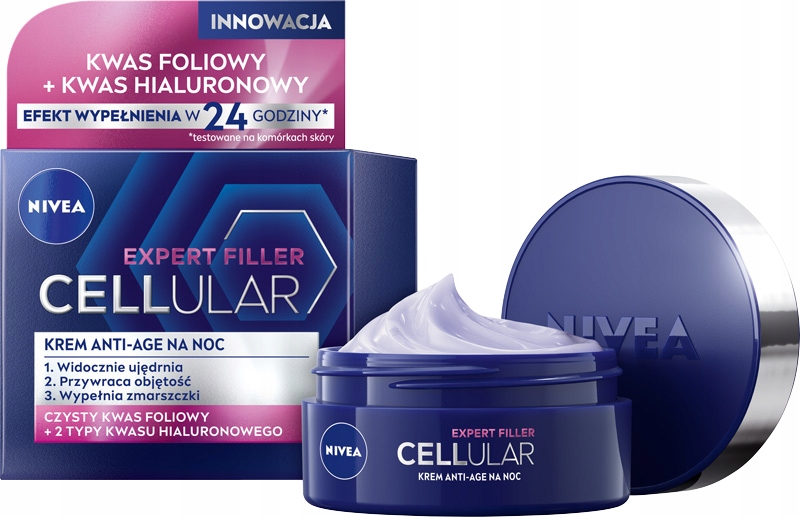 NIVEA HYALURON CELLULAR FILLER Zaawansowany krem anti-age na noc zawiera połączenie składników aktywujących komórki skóry*: Czystego Kwasu Hialuronowego i Boostera Kolagenu. Dzięki temu zaawansowana formuła aktywuje komórki skóry do produkcji własnego kwasu hialuronowego i kolagenu* oraz usprawnia proces odnowy komórek i przyspiesza naturalną regenerację skóry. Bogata formuła szybko się wchłania i wtapia w skórę, wypełniając i wygładzając zmarszczki oraz intensywnie nawilżając i poprawiając jędrność skóry. Krem anti-age regeneruje skórę nocą, kiedy jest najbardziej podatna na wchłanianie składników aktywnych.